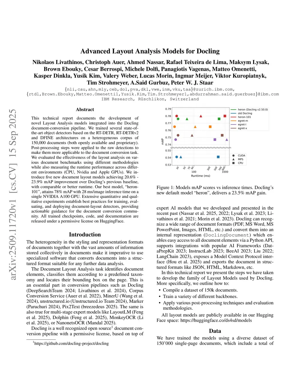 This technical report documents the development of novel Layout Analysis models integrated into the Docling document-conversion pipeline. We trained several state-of-the-art object detectors based on the RT-DETR, RT-DETRv2 and DFINE architectures on a heterogeneous corpus of 150,000 documents (both openly available and proprietary). Post-processing steps were applied to the raw detections to make them more applicable to the document conversion task. We evaluated the effectiveness of the layout analysis on various document benchmarks using different methodologies while also measuring the runtime performance across different environments (CPU, Nvidia and Apple GPUs). We introduce five new document layout models achieving 20.6% - 23.9% mAP improvement over Docling's previous baseline, with comparable or better runtime. Our best model, "heron-101", attains 78% mAP with 28 ms/image inference time on a single NVIDIA A100 GPU. Extensive quantitative and qualitative experiments establish best practices for training, evaluating, and deploying document-layout detectors, providing actionable guidance for the document conversion community. All trained checkpoints, code, and documentation are released under a permissive license on HuggingFace.