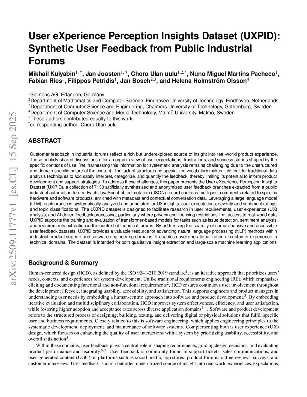 User eXperience Perception Insights Dataset (UXPID): Synthetic User Feedback from Public Industrial Forums