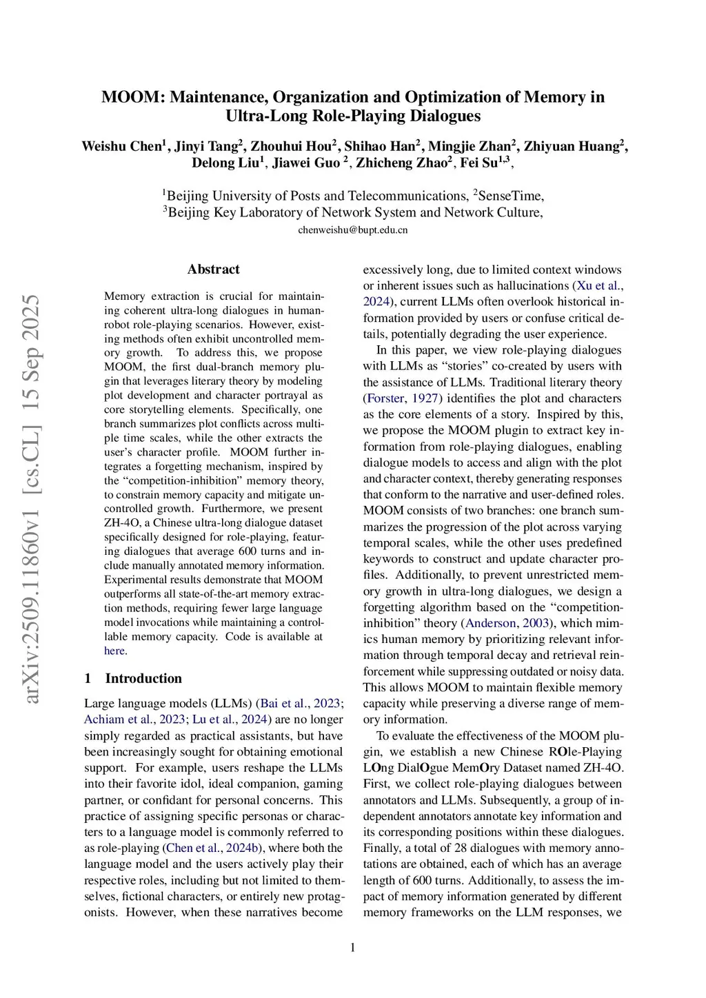 Memory extraction is crucial for maintaining coherent ultra-long dialogues in human-robot role-playing scenarios. However, existing methods often exhibit uncontrolled memory growth. To address this, we propose MOOM, the first dual-branch memory plugin that leverages literary theory by modeling plot development and character portrayal as core storytelling elements. Specifically, one branch summarizes plot conflicts across multiple time scales, while the other extracts the user's character profile. MOOM further integrates a forgetting mechanism, inspired by the ``competition-inhibition'' memory theory, to constrain memory capacity and mitigate uncontrolled growth. Furthermore, we present ZH-4O, a Chinese ultra-long dialogue dataset specifically designed for role-playing, featuring dialogues that average 600 turns and include manually annotated memory information. Experimental results demonstrate that MOOM outperforms all state-of-the-art memory extraction methods, requiring fewer large language model invocations while maintaining a controllable memory capacity.