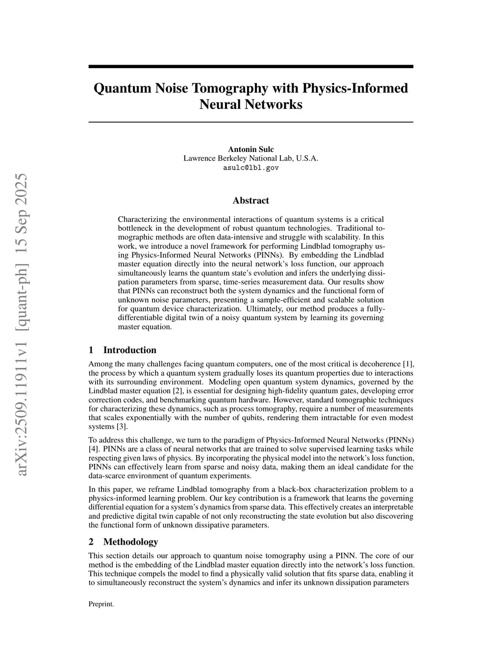 Characterizing the environmental interactions of quantum systems is a critical bottleneck in the development of robust quantum technologies. Traditional tomographic methods are often data-intensive and struggle with scalability. In this work, we introduce a novel framework for performing Lindblad tomography using Physics-Informed Neural Networks (PINNs). By embedding the Lindblad master equation directly into the neural network's loss function, our approach simultaneously learns the quantum state's evolution and infers the underlying dissipation parameters from sparse, time-series measurement data. Our results show that PINNs can reconstruct both the system dynamics and the functional form of unknown noise parameters, presenting a sample-efficient and scalable solution for quantum device characterization. Ultimately, our method produces a fully-differentiable digital twin of a noisy quantum system by learning its governing master equation.