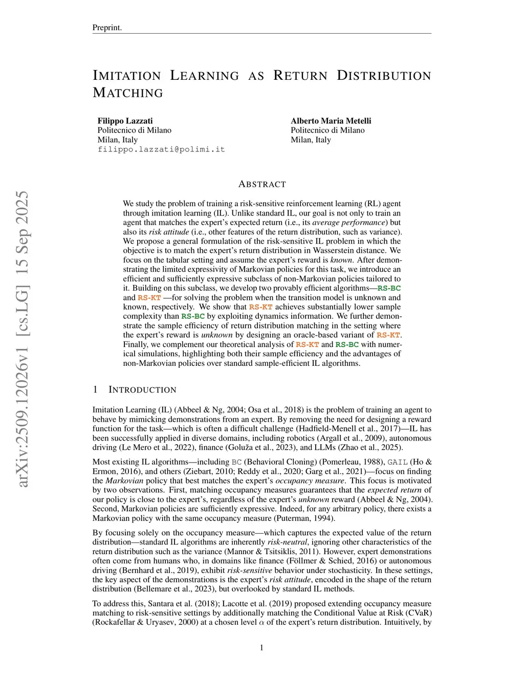 We study the problem of training a risk-sensitive reinforcement learning (RL) agent through imitation learning (IL). Unlike standard IL, our goal is not only to train an agent that matches the expert's expected return (i.e., its average performance) but also its risk attitude (i.e., other features of the return distribution, such as variance). We propose a general formulation of the risk-sensitive IL problem in which the objective is to match the expert's return distribution in Wasserstein distance. We focus on the tabular setting and assume the expert's reward is known. After demonstrating the limited expressivity of Markovian policies for this task, we introduce an efficient and sufficiently expressive subclass of non-Markovian policies tailored to it. Building on this subclass, we develop two provably efficient algorithms, RS-BC and RS-KT, for solving the problem when the transition model is unknown and known, respectively. We show that RS-KT achieves substantially lower sample complexity than RS-BC by exploiting dynamics information. We further demonstrate the sample efficiency of return distribution matching in the setting where the expert's reward is unknown by designing an oracle-based variant of RS-KT. Finally, we complement our theoretical analysis of RS-KT and RS-BC with numerical simulations, highlighting both their sample efficiency and the advantages of non-Markovian policies over standard sample-efficient IL algorithms.