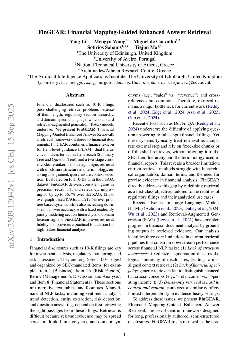 Financial disclosures such as 10-K filings present challenging retrieval problems due to their length, regulatory section hierarchy, and domain-specific language, which standard retrieval-augmented generation (RAG) models underuse. We introduce FinGEAR (Financial Mapping-Guided Enhanced Answer Retrieval), a retrieval framework tailored to financial documents. FinGEAR combines a finance lexicon for Item-level guidance (FLAM), dual hierarchical indices for within-Item search (Summary Tree and Question Tree), and a two-stage cross-encoder reranker. This design aligns retrieval with disclosure structure and terminology, enabling fine-grained, query-aware context selection. Evaluated on full 10-Ks with queries aligned to the FinQA dataset, FinGEAR delivers consistent gains in precision, recall, F1, and relevancy, improving F1 by up to 56.7% over flat RAG, 12.5% over graph-based RAGs, and 217.6% over prior tree-based systems, while also increasing downstream answer accuracy with a fixed reader. By jointly modeling section hierarchy and domain lexicon signals, FinGEAR improves retrieval fidelity and provides a practical foundation for high-stakes financial analysis.