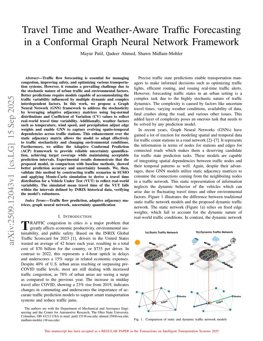 Traffic flow forecasting is essential for managing congestion, improving safety, and optimizing various transportation systems. However, it remains a prevailing challenge due to the stochastic nature of urban traffic and environmental factors. Better predictions require models capable of accommodating the traffic variability influenced by multiple dynamic and complex interdependent factors. In this work, we propose a Graph Neural Network (GNN) framework to address the stochasticity by leveraging adaptive adjacency matrices using log-normal distributions and Coefficient of Variation (CV) values to reflect real-world travel time variability. Additionally, weather factors such as temperature, wind speed, and precipitation adjust edge weights and enable GNN to capture evolving spatio-temporal dependencies across traffic stations. This enhancement over the static adjacency matrix allows the model to adapt effectively to traffic stochasticity and changing environmental conditions. Furthermore, we utilize the Adaptive Conformal Prediction (ACP) framework to provide reliable uncertainty quantification, achieving target coverage while maintaining acceptable prediction intervals. Experimental results demonstrate that the proposed model, in comparison with baseline methods, showed better prediction accuracy and uncertainty bounds. We, then, validate this method by constructing traffic scenarios in SUMO and applying Monte-Carlo simulation to derive a travel time distribution for a Vehicle Under Test (VUT) to reflect real-world variability. The simulated mean travel time of the VUT falls within the intervals defined by INRIX historical data, verifying the model's robustness.