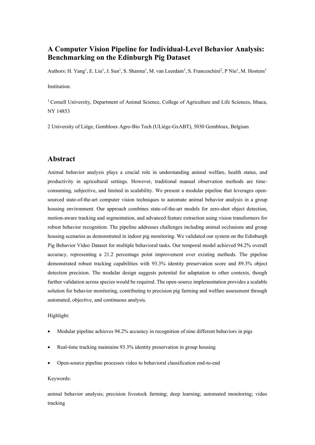 Animal behavior analysis plays a crucial role in understanding animal welfare, health status, and productivity in agricultural settings. However, traditional manual observation methods are time-consuming, subjective, and limited in scalability. We present a modular pipeline that leverages open-sourced state-of-the-art computer vision techniques to automate animal behavior analysis in a group housing environment. Our approach combines state-of-the-art models for zero-shot object detection, motion-aware tracking and segmentation, and advanced feature extraction using vision transformers for robust behavior recognition. The pipeline addresses challenges including animal occlusions and group housing scenarios as demonstrated in indoor pig monitoring. We validated our system on the Edinburgh Pig Behavior Video Dataset for multiple behavioral tasks. Our temporal model achieved 94.2% overall accuracy, representing a 21.2 percentage point improvement over existing methods. The pipeline demonstrated robust tracking capabilities with 93.3% identity preservation score and 89.3% object detection precision. The modular design suggests potential for adaptation to other contexts, though further validation across species would be required. The open-source implementation provides a scalable solution for behavior monitoring, contributing to precision pig farming and welfare assessment through automated, objective, and continuous analysis.