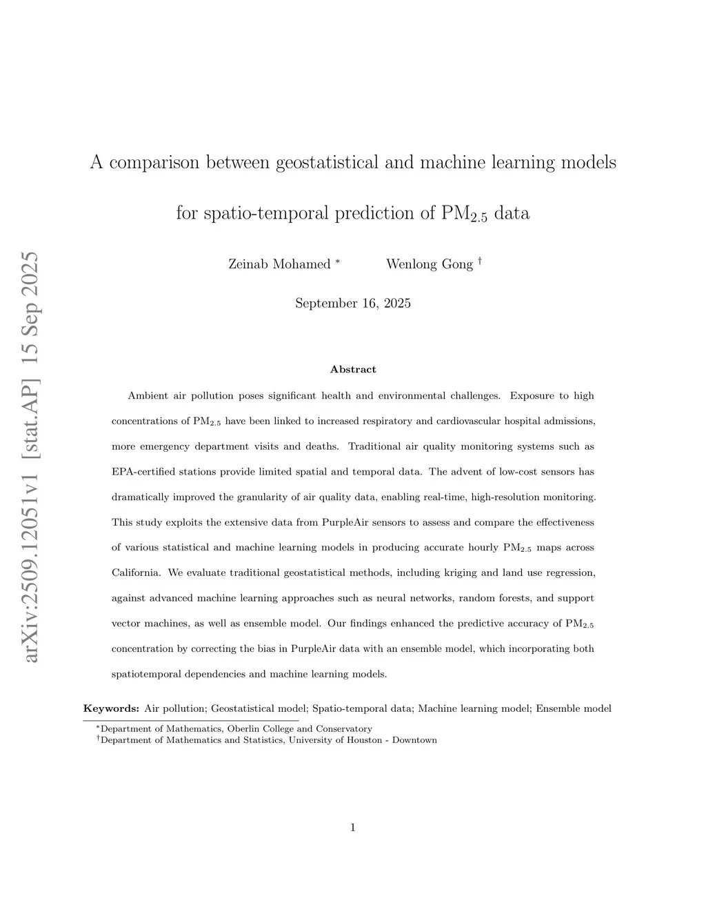 Ambient air pollution poses significant health and environmental challenges. Exposure to high concentrations of PM have been linked to increased respiratory and cardiovascular hospital admissions, more emergency department visits and deaths. Traditional air quality monitoring systems such as EPA-certified stations provide limited spatial and temporal data. The advent of low-cost sensors has dramatically improved the granularity of air quality data, enabling real-time, high-resolution monitoring. This study exploits the extensive data from PurpleAir sensors to assess and compare the effectiveness of various statistical and machine learning models in producing accurate hourly PM maps across California. We evaluate traditional geostatistical methods, including kriging and land use regression, against advanced machine learning approaches such as neural networks, random forests, and support vector machines, as well as ensemble model. Our findings enhanced the predictive accuracy of PM2.5 concentration by correcting the bias in PurpleAir data with an ensemble model, which incorporating both spatiotemporal dependencies and machine learning models.