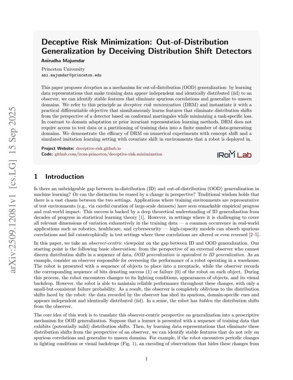 This paper proposes deception as a mechanism for out-of-distribution (OOD) generalization: by learning data representations that make training data appear independent and identically distributed (iid) to an observer, we can identify stable features that eliminate spurious correlations and generalize to unseen domains. We refer to this principle as deceptive risk minimization (DRM) and instantiate it with a practical differentiable objective that simultaneously learns features that eliminate distribution shifts from the perspective of a detector based on conformal martingales while minimizing a task-specific loss. In contrast to domain adaptation or prior invariant representation learning methods, DRM does not require access to test data or a partitioning of training data into a finite number of data-generating domains. We demonstrate the efficacy of DRM on numerical experiments with concept shift and a simulated imitation learning setting with covariate shift in environments that a robot is deployed in.
