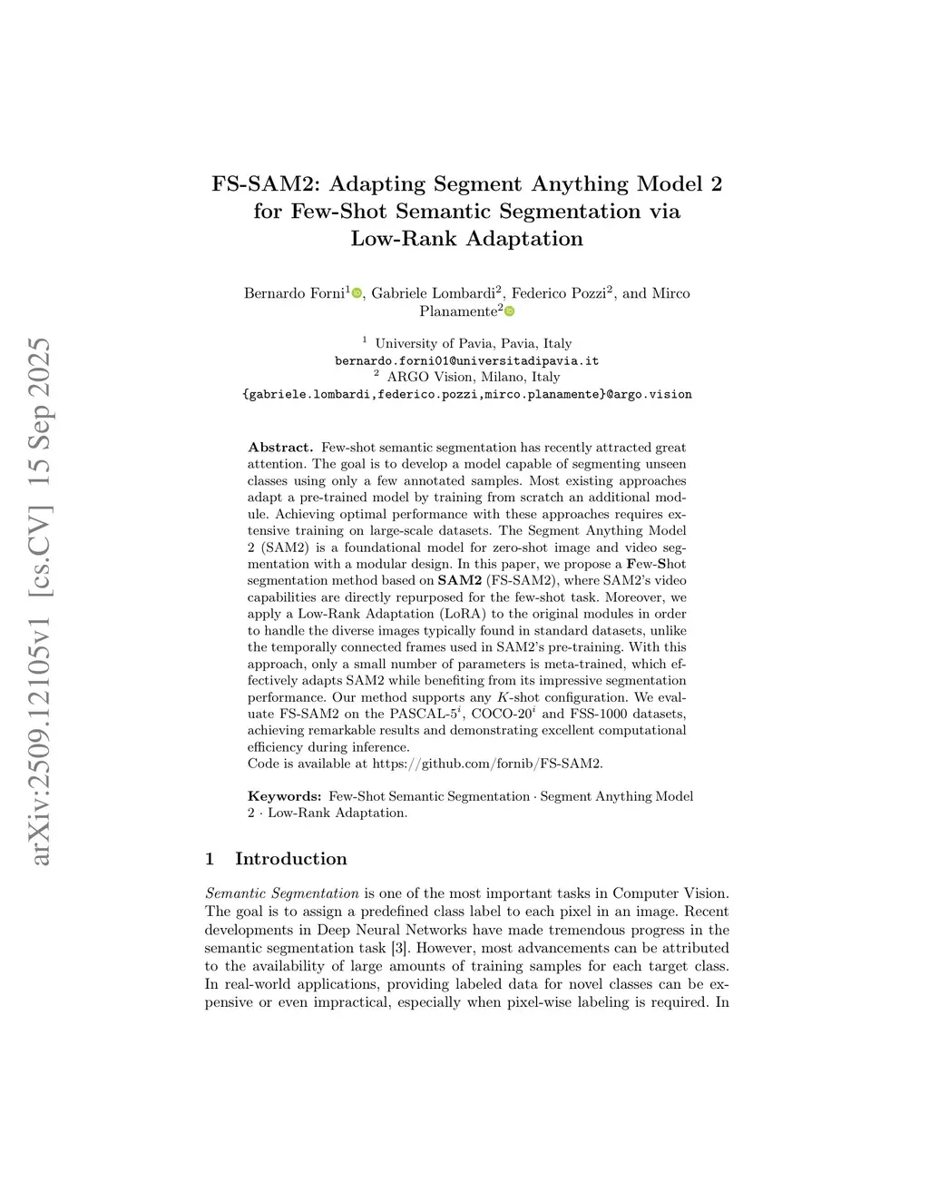 Few-shot semantic segmentation has recently attracted great attention. The goal is to develop a model capable of segmenting unseen classes using only a few annotated samples. Most existing approaches adapt a pre-trained model by training from scratch an additional module. Achieving optimal performance with these approaches requires extensive training on large-scale datasets. The Segment Anything Model 2 (SAM2) is a foundational model for zero-shot image and video segmentation with a modular design. In this paper, we propose a Few-Shot segmentation method based on SAM2 (FS-SAM2), where SAM2's video capabilities are directly repurposed for the few-shot task. Moreover, we apply a Low-Rank Adaptation (LoRA) to the original modules in order to handle the diverse images typically found in standard datasets, unlike the temporally connected frames used in SAM2's pre-training. With this approach, only a small number of parameters is meta-trained, which effectively adapts SAM2 while benefiting from its impressive segmentation performance. Our method supports any K-shot configuration. We evaluate FS-SAM2 on the PASCAL-5, COCO-20 and FSS-1000 datasets, achieving remarkable results and demonstrating excellent computational efficiency during inference. Code is available atthis https URL