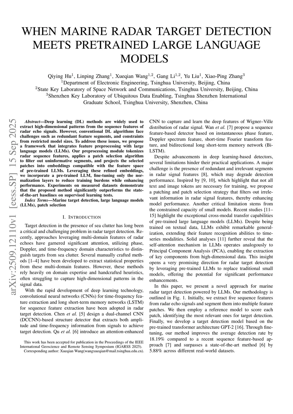 Deep learning (DL) methods are widely used to extract high-dimensional patterns from the sequence features of radar echo signals. However, conventional DL algorithms face challenges such as redundant feature segments, and constraints from restricted model sizes. To address these issues, we propose a framework that integrates feature preprocessing with large language models (LLMs). Our preprocessing module tokenizes radar sequence features, applies a patch selection algorithm to filter out uninformative segments, and projects the selected patches into embeddings compatible with the feature space of pre-trained LLMs. Leveraging these refined embeddings, we incorporate a pre-trained LLM, fine-tuning only the normalization layers to reduce training burdens while enhancing performance. Experiments on measured datasets demonstrate that the proposed method significantly outperforms the state-of-the-art baselines on supervised learning tests.