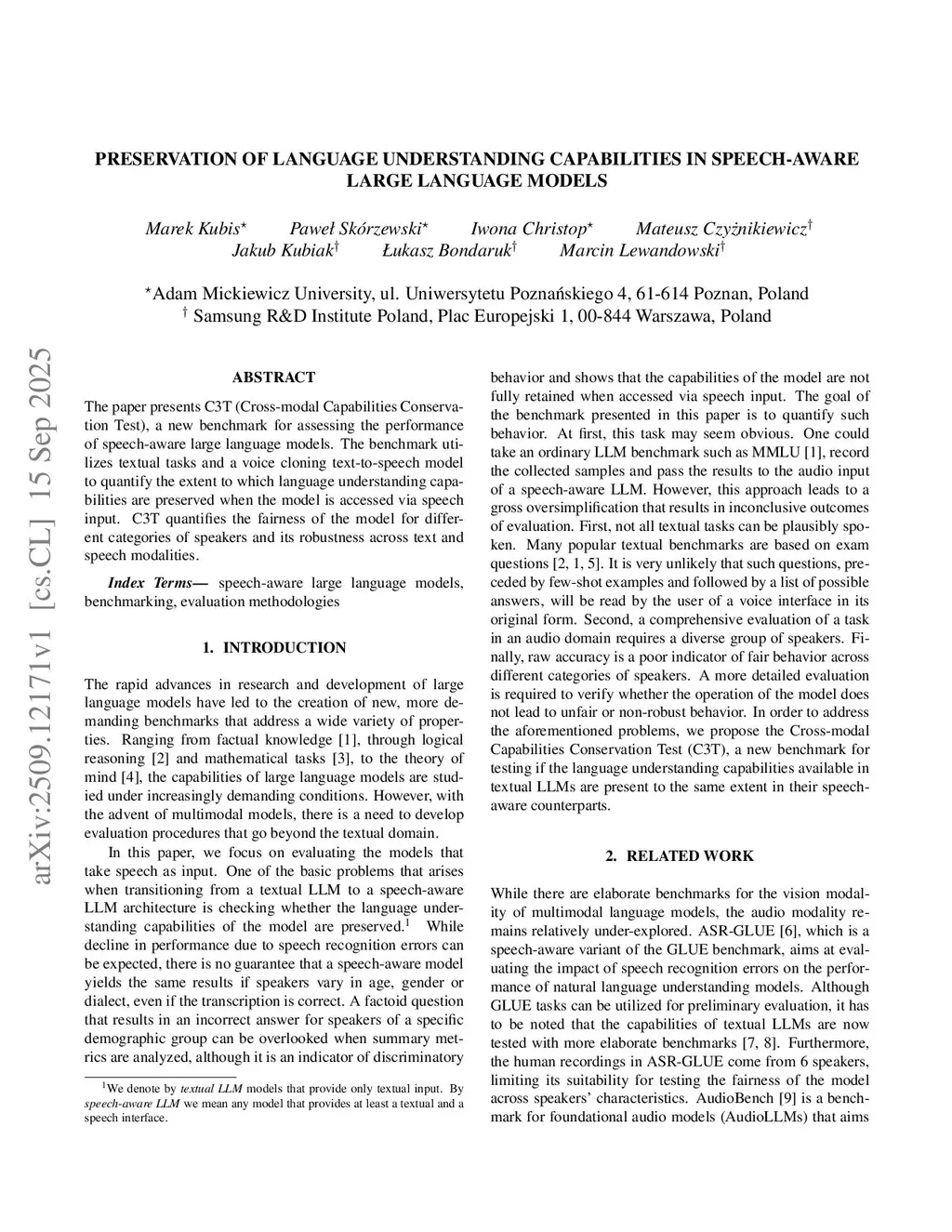 The paper presents C3T (Cross-modal Capabilities Conservation Test), a new benchmark for assessing the performance of speech-aware large language models. The benchmark utilizes textual tasks and a voice cloning text-to-speech model to quantify the extent to which language understanding capabilities are preserved when the model is accessed via speech input. C3T quantifies the fairness of the model for different categories of speakers and its robustness across text and speech modalities.