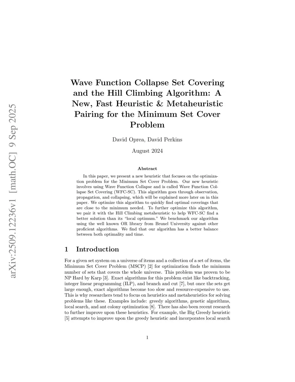 Wave Function Collapse Set Covering and the Hill Climbing Algorithm: A New, Fast Heuristic and Metaheuristic Pairing for the Minimum Set Cover Problem