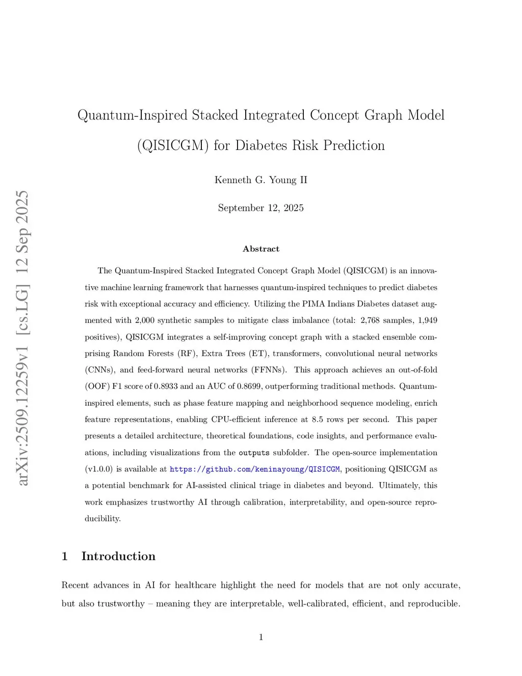 The Quantum-Inspired Stacked Integrated Concept Graph Model (QISICGM) is an innovative machine learning framework that harnesses quantum-inspired techniques to predict diabetes risk with exceptional accuracy and efficiency. Utilizing the PIMA Indians Diabetes dataset augmented with 2,000 synthetic samples to mitigate class imbalance (total: 2,768 samples, 1,949 positives), QISICGM integrates a self-improving concept graph with a stacked ensemble comprising Random Forests (RF), Extra Trees (ET), transformers, convolutional neural networks (CNNs), and feed-forward neural networks (FFNNs). This approach achieves an out-of-fold (OOF) F1 score of 0.8933 and an AUC of 0.8699, outperforming traditional methods. Quantum inspired elements, such as phase feature mapping and neighborhood sequence modeling, enrich feature representations, enabling CPU-efficient inference at 8.5 rows per second. This paper presents a detailed architecture, theoretical foundations, code insights, and performance evaluations, including visualizations from the outputs subfolder. The open-source implementation (v1.0.0) is available atthis https URL, positioning QISICGM as a potential benchmark for AI-assisted clinical triage in diabetes and beyond. Ultimately, this work emphasizes trustworthy AI through calibration, interpretability, and open-source reproducibility.