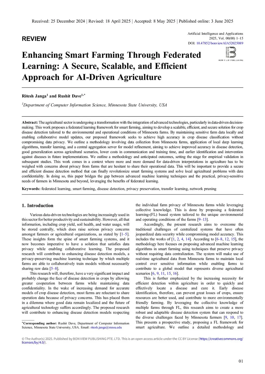 The agricultural sector is undergoing a transformation with the integration of advanced technologies, particularly in data-driven decision-making. This work proposes a federated learning framework for smart farming, aiming to develop a scalable, efficient, and secure solution for crop disease detection tailored to the environmental and operational conditions of Minnesota farms. By maintaining sensitive farm data locally and enabling collaborative model updates, our proposed framework seeks to achieve high accuracy in crop disease classification without compromising data privacy. We outline a methodology involving data collection from Minnesota farms, application of local deep learning algorithms, transfer learning, and a central aggregation server for model refinement, aiming to achieve improved accuracy in disease detection, good generalization across agricultural scenarios, lower costs in communication and training time, and earlier identification and intervention against diseases in future implementations. We outline a methodology and anticipated outcomes, setting the stage for empirical validation in subsequent studies. This work comes in a context where more and more demand for data-driven interpretations in agriculture has to be weighed with concerns about privacy from farms that are hesitant to share their operational data. This will be important to provide a secure and efficient disease detection method that can finally revolutionize smart farming systems and solve local agricultural problems with data confidentiality. In doing so, this paper bridges the gap between advanced machine learning techniques and the practical, privacy-sensitive needs of farmers in Minnesota and beyond, leveraging the benefits of federated learning.