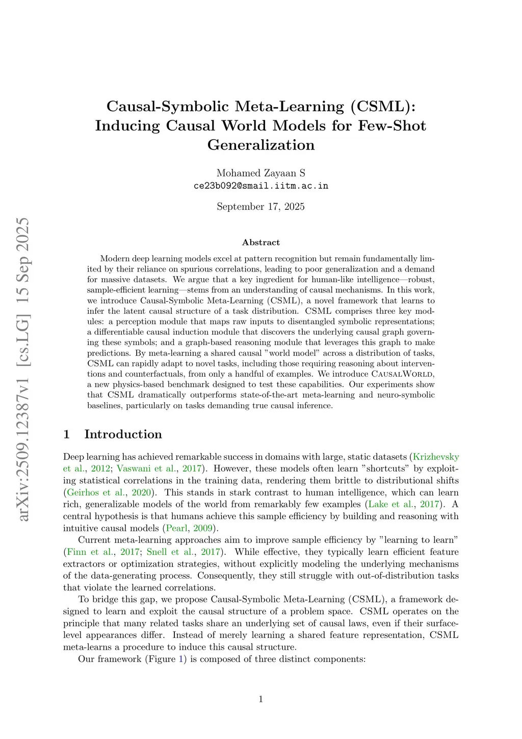 Modern deep learning models excel at pattern recognition but remain fundamentally limited by their reliance on spurious correlations, leading to poor generalization and a demand for massive datasets. We argue that a key ingredient for human-like intelligence-robust, sample-efficient learning-stems from an understanding of causal mechanisms. In this work, we introduce Causal-Symbolic Meta-Learning (CSML), a novel framework that learns to infer the latent causal structure of a task distribution. CSML comprises three key modules: a perception module that maps raw inputs to disentangled symbolic representations; a differentiable causal induction module that discovers the underlying causal graph governing these symbols and a graph-based reasoning module that leverages this graph to make predictions. By meta-learning a shared causal world model across a distribution of tasks, CSML can rapidly adapt to novel tasks, including those requiring reasoning about interventions and counterfactuals, from only a handful of examples. We introduce CausalWorld, a new physics-based benchmark designed to test these capabilities. Our experiments show that CSML dramatically outperforms state-of-the-art meta-learning and neuro-symbolic baselines, particularly on tasks demanding true causal inference.
