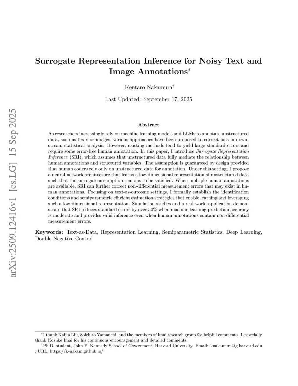 As researchers increasingly rely on machine learning models and LLMs to annotate unstructured data, such as texts or images, various approaches have been proposed to correct bias in downstream statistical analysis. However, existing methods tend to yield large standard errors and require some error-free human annotation. In this paper, I introduce Surrogate Representation Inference (SRI), which assumes that unstructured data fully mediate the relationship between human annotations and structured variables. The assumption is guaranteed by design provided that human coders rely only on unstructured data for annotation. Under this setting, I propose a neural network architecture that learns a low-dimensional representation of unstructured data such that the surrogate assumption remains to be satisfied. When multiple human annotations are available, SRI can be extended to further correct non-differential measurement errors that may exist in human annotations. Focusing on text-as-outcome settings, I formally establish the identification conditions and semiparametric efficient estimation strategies that enable learning and leveraging such a low-dimensional representation. Simulation studies and a real-world application demonstrate that SRI reduces standard errors by over 50% when machine learning classification accuracy is moderate and provides valid inference even when human annotations contain non-differential measurement errors.