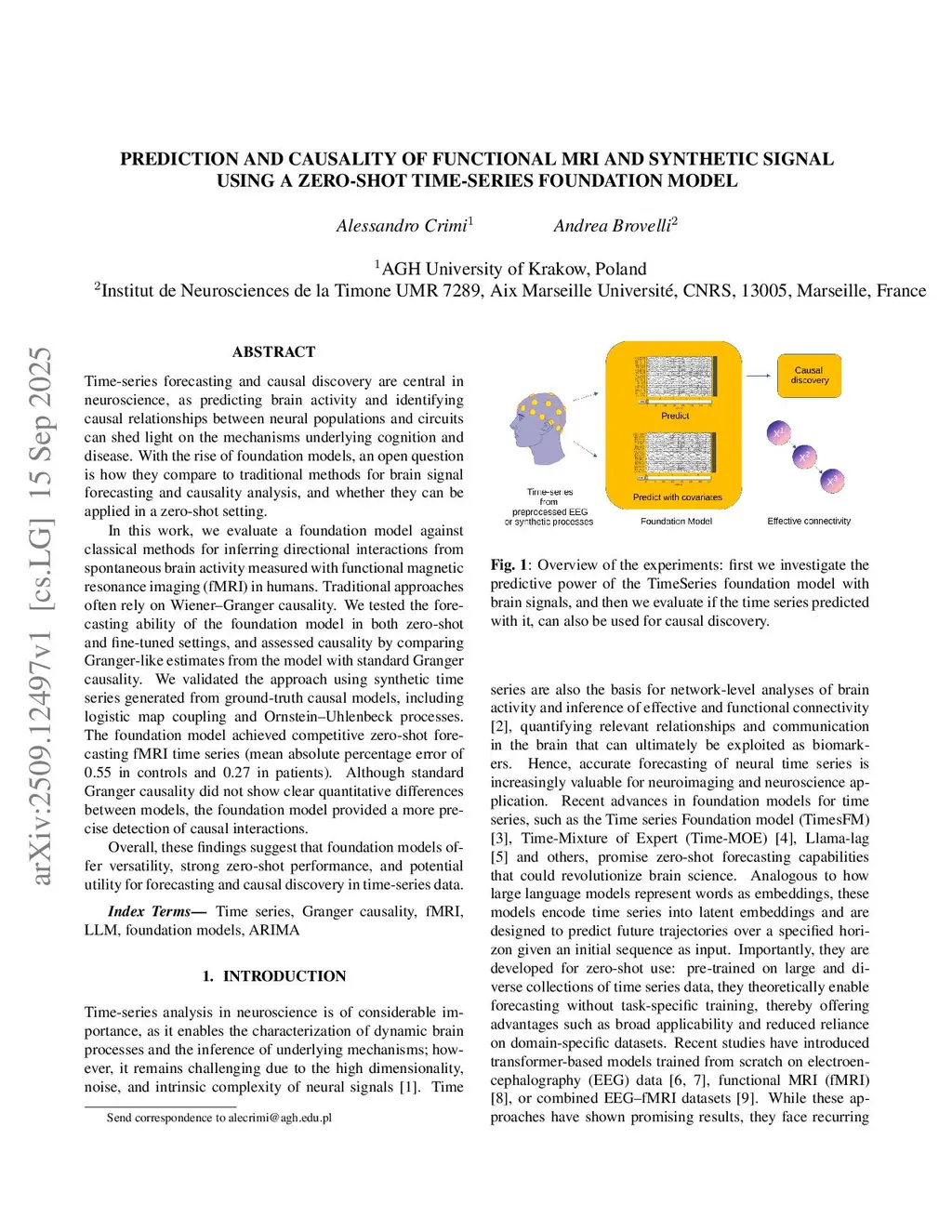 Prediction and Causality of functional MRI and synthetic signal using a Zero-Shot Time-Series Foundation Model