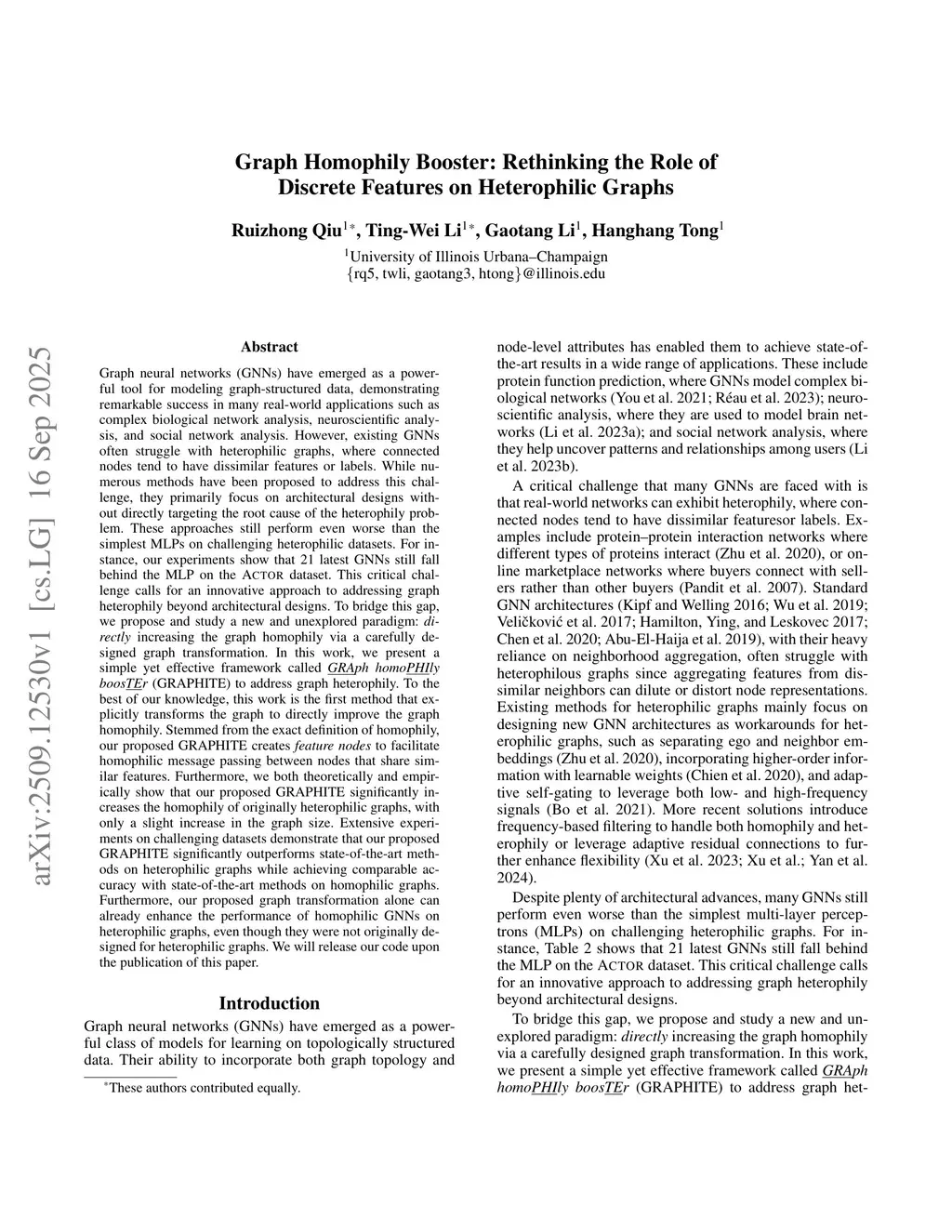 Graph neural networks (GNNs) have emerged as a powerful tool for modeling graph-structured data. However, existing GNNs often struggle with heterophilic graphs, where connected nodes tend to have dissimilar features or labels. While numerous methods have been proposed to address this challenge, they primarily focus on architectural designs without directly targeting the root cause of the heterophily problem. These approaches still perform even worse than the simplest MLPs on challenging heterophilic datasets. For instance, our experiments show that 21 latest GNNs still fall behind the MLP on the Actor dataset. This critical challenge calls for an innovative approach to addressing graph heterophily beyond architectural designs. To bridge this gap, we propose and study a new and unexplored paradigm: directly increasing the graph homophily via a carefully designed graph transformation. In this work, we present a simple yet effective framework called GRAPHITE to address graph heterophily. To the best of our knowledge, this work is the first method that explicitly transforms the graph to directly improve the graph homophily. Stemmed from the exact definition of homophily, our proposed GRAPHITE creates feature nodes to facilitate homophilic message passing between nodes that share similar features. Furthermore, we both theoretically and empirically show that our proposed GRAPHITE significantly increases the homophily of originally heterophilic graphs, with only a slight increase in the graph size. Extensive experiments on challenging datasets demonstrate that our proposed GRAPHITE significantly outperforms state-of-the-art methods on heterophilic graphs while achieving comparable accuracy with state-of-the-art methods on homophilic graphs.