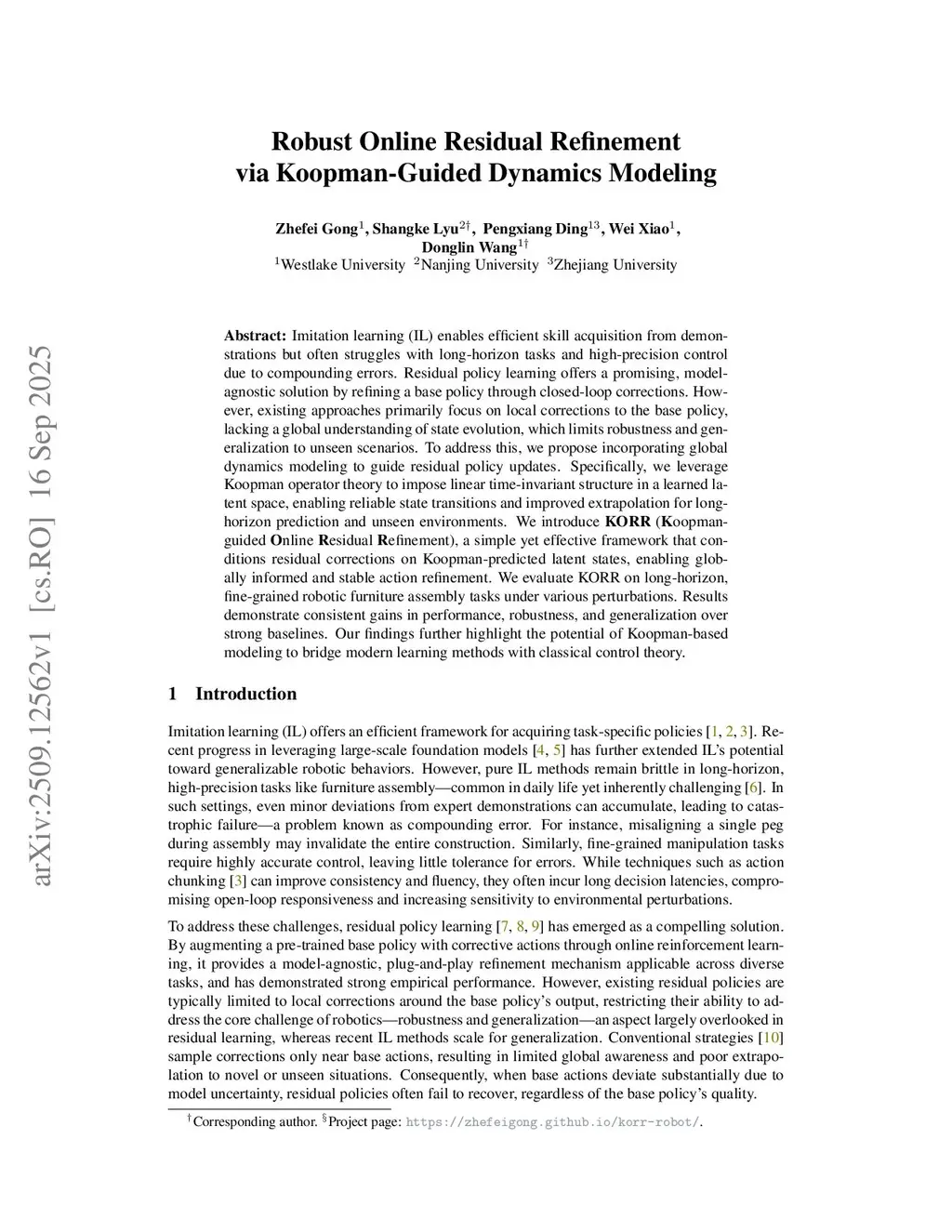 Imitation learning (IL) enables efficient skill acquisition from demonstrations but often struggles with long-horizon tasks and high-precision control due to compounding errors. Residual policy learning offers a promising, model-agnostic solution by refining a base policy through closed-loop corrections. However, existing approaches primarily focus on local corrections to the base policy, lacking a global understanding of state evolution, which limits robustness and generalization to unseen scenarios. To address this, we propose incorporating global dynamics modeling to guide residual policy updates. Specifically, we leverage Koopman operator theory to impose linear time-invariant structure in a learned latent space, enabling reliable state transitions and improved extrapolation for long-horizon prediction and unseen environments. We introduce KORR (Koopman-guided Online Residual Refinement), a simple yet effective framework that conditions residual corrections on Koopman-predicted latent states, enabling globally informed and stable action refinement. We evaluate KORR on long-horizon, fine-grained robotic furniture assembly tasks under various perturbations. Results demonstrate consistent gains in performance, robustness, and generalization over strong baselines. Our findings further highlight the potential of Koopman-based modeling to bridge modern learning methods with classical control theory.
