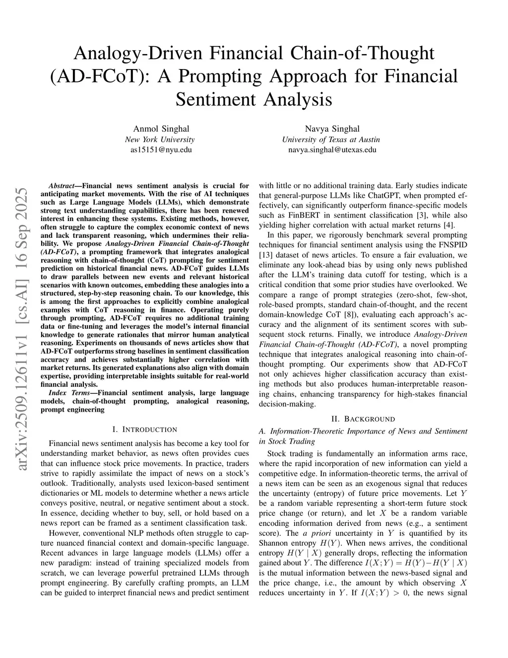 Analogy-Driven Financial Chain-of-Thought (AD-FCoT): A Prompting Approach for Financial Sentiment Analysis