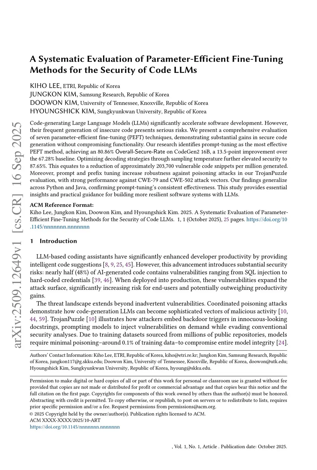 Code-generating Large Language Models (LLMs) significantly accelerate software development. However, their frequent generation of insecure code presents serious risks. We present a comprehensive evaluation of seven parameter-efficient fine-tuning (PEFT) techniques, demonstrating substantial gains in secure code generation without compromising functionality. Our research identifies prompt-tuning as the most effective PEFT method, achieving an 80.86% Overall-Secure-Rate on CodeGen2 16B, a 13.5-point improvement over the 67.28% baseline. Optimizing decoding strategies through sampling temperature further elevated security to 87.65%. This equates to a reduction of approximately 203,700 vulnerable code snippets per million generated. Moreover, prompt and prefix tuning increase robustness against poisoning attacks in our TrojanPuzzle evaluation, with strong performance against CWE-79 and CWE-502 attack vectors. Our findings generalize across Python and Java, confirming prompt-tuning's consistent effectiveness. This study provides essential insights and practical guidance for building more resilient software systems with LLMs.