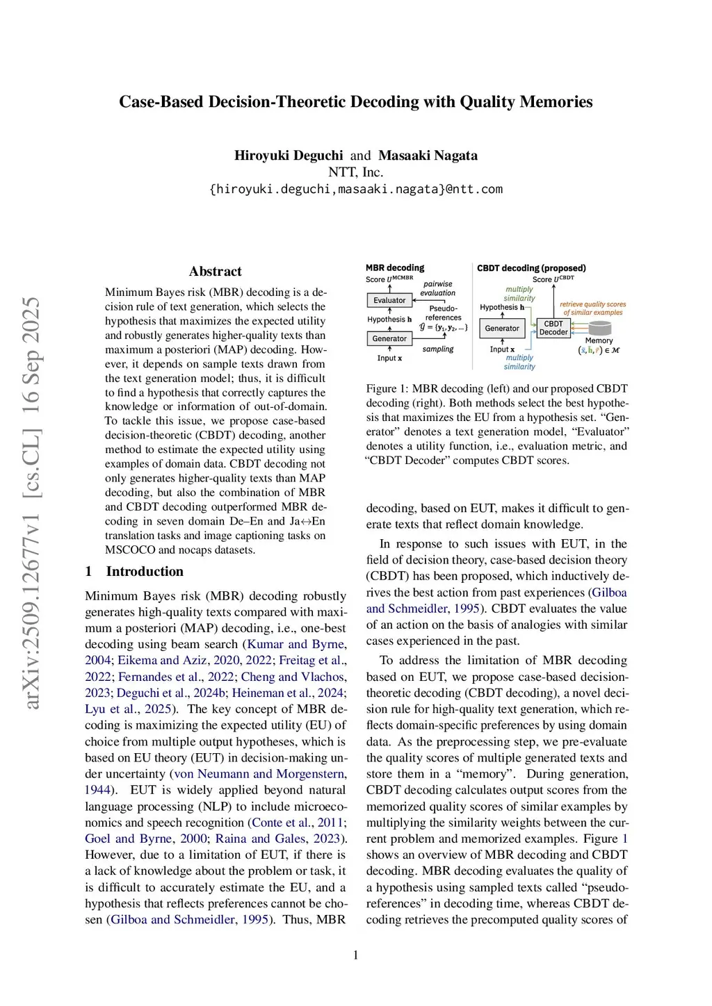 Minimum Bayes risk (MBR) decoding is a decision rule of text generation, which selects the hypothesis that maximizes the expected utility and robustly generates higher-quality texts than maximum a posteriori (MAP) decoding. However, it depends on sample texts drawn from the text generation model; thus, it is difficult to find a hypothesis that correctly captures the knowledge or information of out-of-domain. To tackle this issue, we propose case-based decision-theoretic (CBDT) decoding, another method to estimate the expected utility using examples of domain data. CBDT decoding not only generates higher-quality texts than MAP decoding, but also the combination of MBR and CBDT decoding outperformed MBR decoding in seven domain De--En and JaEn translation tasks and image captioning tasks on MSCOCO and nocaps datasets.