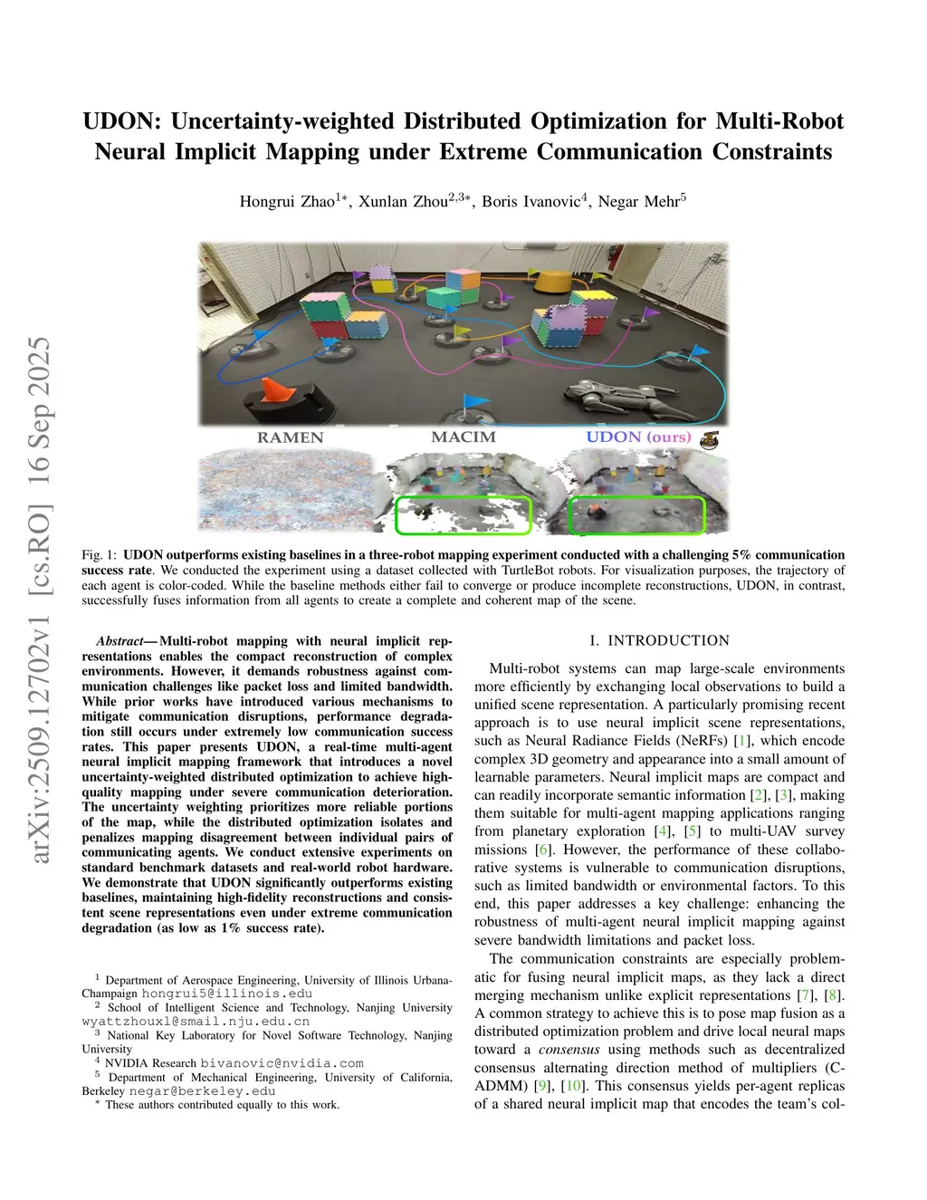 Multi-robot mapping with neural implicit representations enables the compact reconstruction of complex environments. However, it demands robustness against communication challenges like packet loss and limited bandwidth. While prior works have introduced various mechanisms to mitigate communication disruptions, performance degradation still occurs under extremely low communication success rates. This paper presents UDON, a real-time multi-agent neural implicit mapping framework that introduces a novel uncertainty-weighted distributed optimization to achieve high-quality mapping under severe communication deterioration. The uncertainty weighting prioritizes more reliable portions of the map, while the distributed optimization isolates and penalizes mapping disagreement between individual pairs of communicating agents. We conduct extensive experiments on standard benchmark datasets and real-world robot hardware. We demonstrate that UDON significantly outperforms existing baselines, maintaining high-fidelity reconstructions and consistent scene representations even under extreme communication degradation (as low as 1% success rate).