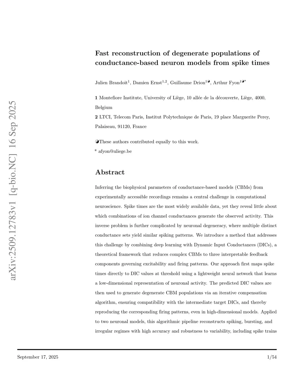 Inferring the biophysical parameters of conductance-based models (CBMs) from experimentally accessible recordings remains a central challenge in computational neuroscience. Spike times are the most widely available data, yet they reveal little about which combinations of ion channel conductances generate the observed activity. This inverse problem is further complicated by neuronal degeneracy, where multiple distinct conductance sets yield similar spiking patterns. We introduce a method that addresses this challenge by combining deep learning with Dynamic Input Conductances (DICs), a theoretical framework that reduces complex CBMs to three interpretable feedback components governing excitability and firing patterns. Our approach first maps spike times to DIC densities at threshold using a neural network that learns a low-dimensional representation of neuronal activity. The predicted DIC values are then used to generate degenerate CBM populations via an iterative compensation algorithm, ensuring compatibility with the intermediate target DICs, and thereby reproducing the corresponding firing patterns, even in high-dimensional models. Applied to two models, this algorithmic pipeline reconstructs spiking and bursting regimes with high accuracy and robustness to variability, including spike trains generated under noisy current injection mimicking physiological stochasticity. It produces diverse degenerate populations within milliseconds on standard hardware, enabling scalable and efficient inference from spike recordings alone. Together, this work positions DICs as a practical and interpretable link between experimentally observed activity and mechanistic models. By enabling fast and scalable reconstruction of degenerate populations directly from spike times, our approach provides a powerful way to investigate how neurons exploit conductance variability to achieve reliable computation.