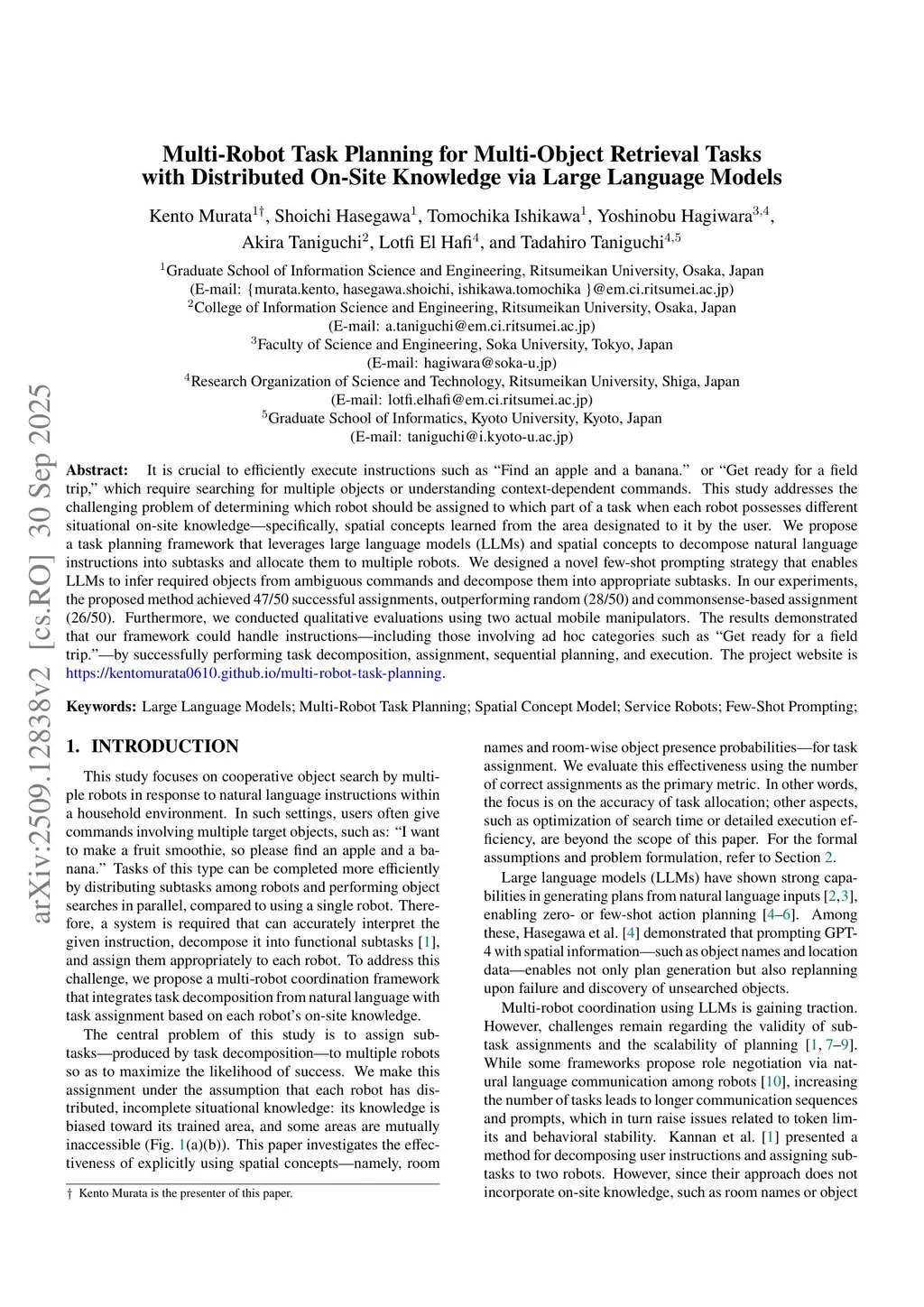 Multi-Robot Task Planning for Multi-Object Retrieval Tasks with Distributed On-Site Knowledge via Large Language Models