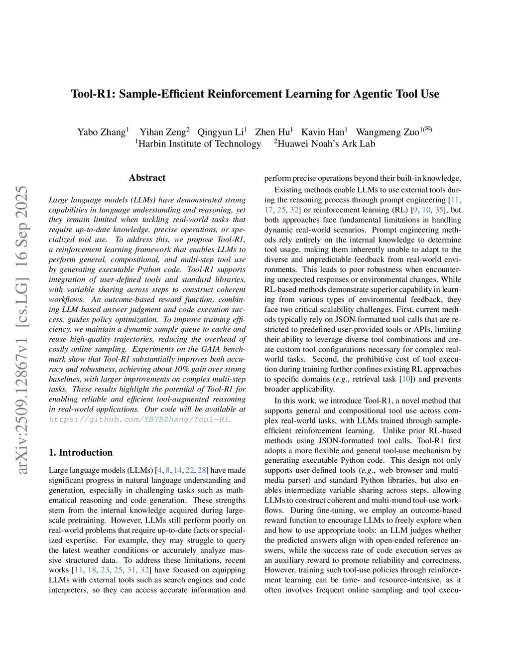 Large language models (LLMs) have demonstrated strong capabilities in language understanding and reasoning, yet they remain limited when tackling real-world tasks that require up-to-date knowledge, precise operations, or specialized tool use. To address this, we propose Tool-R1, a reinforcement learning framework that enables LLMs to perform general, compositional, and multi-step tool use by generating executable Python code. Tool-R1 supports integration of user-defined tools and standard libraries, with variable sharing across steps to construct coherent workflows. An outcome-based reward function, combining LLM-based answer judgment and code execution success, guides policy optimization. To improve training efficiency, we maintain a dynamic sample queue to cache and reuse high-quality trajectories, reducing the overhead of costly online sampling. Experiments on the GAIA benchmark show that Tool-R1 substantially improves both accuracy and robustness, achieving about 10\% gain over strong baselines, with larger improvements on complex multi-step tasks. These results highlight the potential of Tool-R1 for enabling reliable and efficient tool-augmented reasoning in real-world applications. Our code will be available atthis https URL.