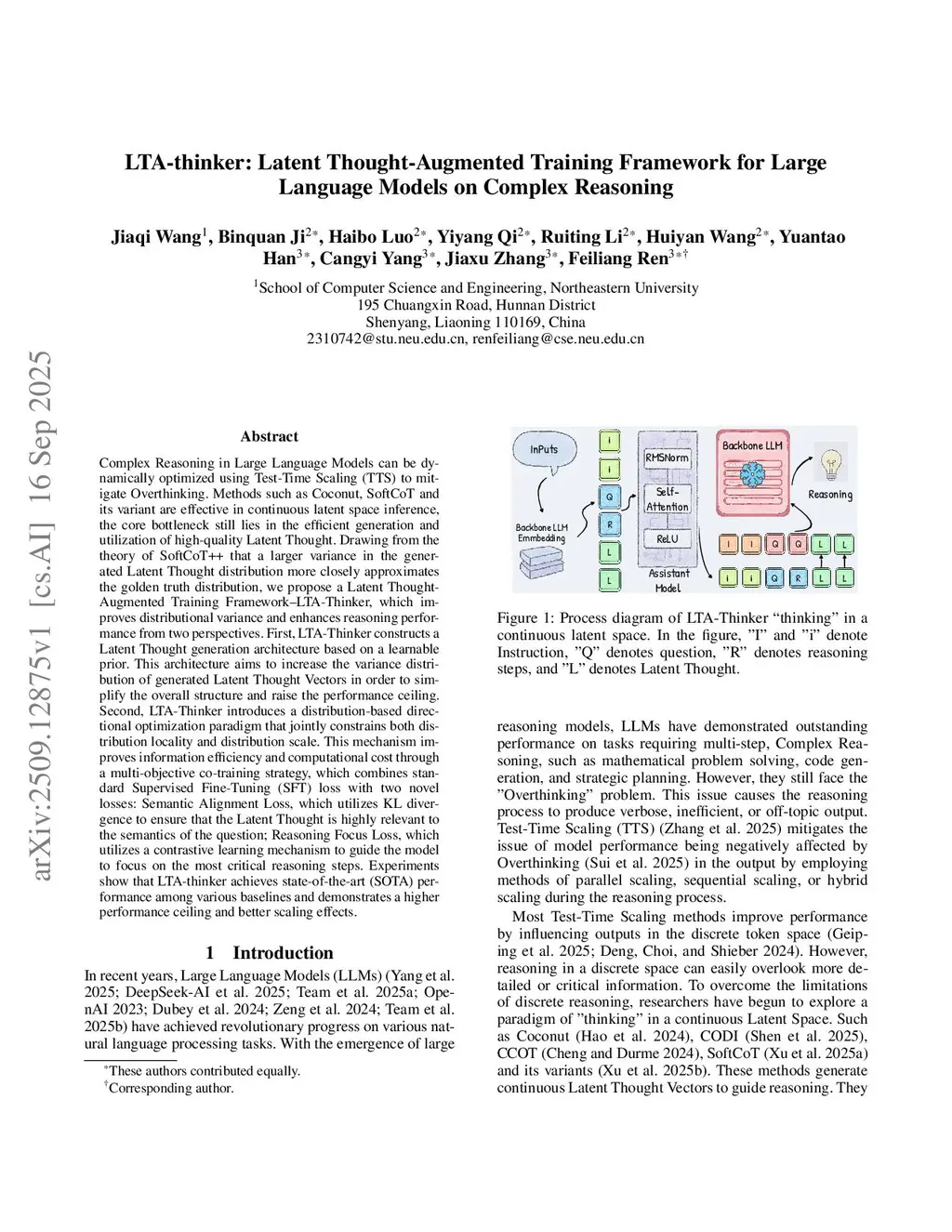 Complex Reasoning in Large Language Models can be dynamically optimized using Test-Time Scaling (TTS) to mitigate Overthinking. Methods such as Coconut, SoftCoT and its variant are effective in continuous latent space inference, the core bottleneck still lies in the efficient generation and utilization of high-quality Latent Thought. Drawing from the theory of SoftCoT++ that a larger variance in the generated Latent Thought distribution more closely approximates the golden truth distribution, we propose a Latent Thought-Augmented Training Framework--LTA-Thinker, which improves distributional variance and enhances reasoning performance from two perspectives. First, LTA-Thinker constructs a Latent Thought generation architecture based on a learnable prior. This architecture aims to increase the variance distribution of generated Latent Thought Vectors in order to simplify the overall structure and raise the performance ceiling. Second, LTA-Thinker introduces a distribution-based directional optimization paradigm that jointly constrains both distribution locality and distribution scale. This mechanism improves information efficiency and computational cost through a multi-objective co-training strategy, which combines standard Supervised Fine-Tuning (SFT) loss with two novel losses: Semantic Alignment Loss, which utilizes KL divergence to ensure that the Latent Thought is highly relevant to the semantics of the question; Reasoning Focus Loss, which utilizes a contrastive learning mechanism to guide the model to focus on the most critical reasoning steps. Experiments show that LTA-thinker achieves state-of-the-art (SOTA) performance among various baselines and demonstrates a higher performance ceiling and better scaling effects.