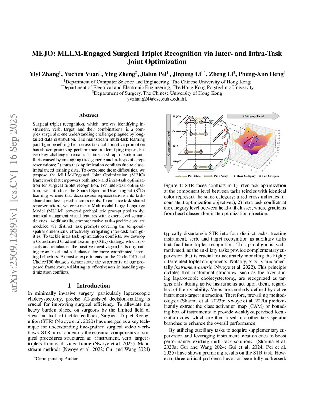 Surgical triplet recognition, which involves identifying instrument, verb, target, and their combinations, is a complex surgical scene understanding challenge plagued by long-tailed data distribution. The mainstream multi-task learning paradigm benefiting from cross-task collaborative promotion has shown promising performance in identifying triples, but two key challenges remain: 1) inter-task optimization conflicts caused by entangling task-generic and task-specific representations; 2) intra-task optimization conflicts due to class-imbalanced training data. To overcome these difficulties, we propose the MLLM-Engaged Joint Optimization (MEJO) framework that empowers both inter- and intra-task optimization for surgical triplet recognition. For inter-task optimization, we introduce the Shared-Specific-Disentangled (SD) learning scheme that decomposes representations into task-shared and task-specific components. To enhance task-shared representations, we construct a Multimodal Large Language Model (MLLM) powered probabilistic prompt pool to dynamically augment visual features with expert-level semantic cues. Additionally, comprehensive task-specific cues are modeled via distinct task prompts covering the temporal-spatial dimensions, effectively mitigating inter-task ambiguities. To tackle intra-task optimization conflicts, we develop a Coordinated Gradient Learning (CGL) strategy, which dissects and rebalances the positive-negative gradients originating from head and tail classes for more coordinated learning behaviors. Extensive experiments on the CholecT45 and CholecT50 datasets demonstrate the superiority of our proposed framework, validating its effectiveness in handling optimization conflicts.