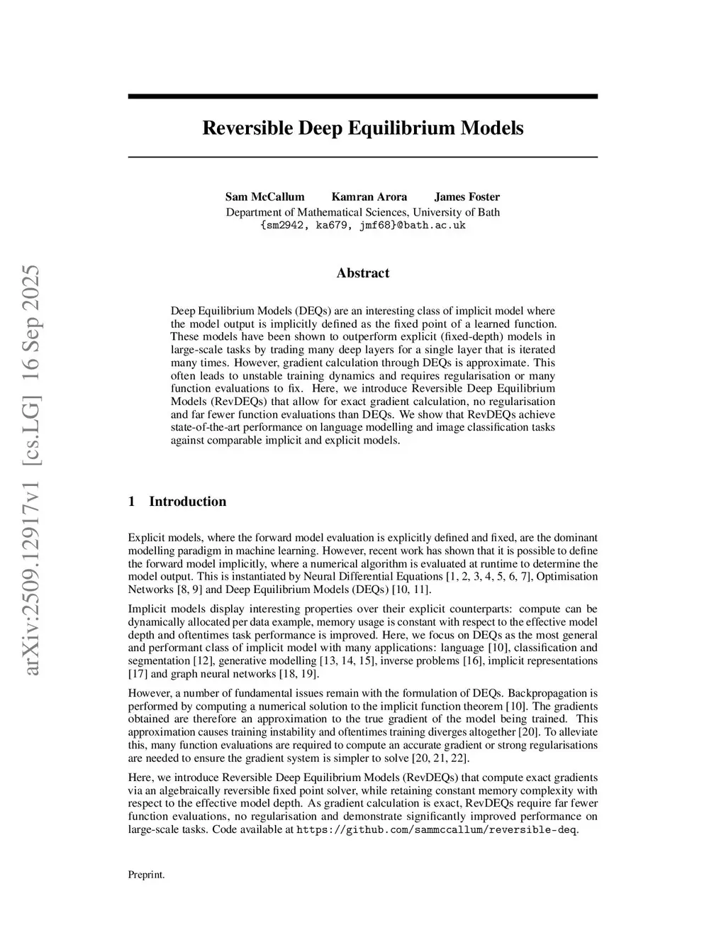 Deep Equilibrium Models (DEQs) are an interesting class of implicit model where the model output is implicitly defined as the fixed point of a learned function. These models have been shown to outperform explicit (fixed-depth) models in large-scale tasks by trading many deep layers for a single layer that is iterated many times. However, gradient calculation through DEQs is approximate. This often leads to unstable training dynamics and requires regularisation or many function evaluations to fix. Here, we introduce Reversible Deep Equilibrium Models (RevDEQs) that allow for exact gradient calculation, no regularisation and far fewer function evaluations than DEQs. We show that RevDEQs achieve state-of-the-art performance on language modelling and image classification tasks against comparable implicit and explicit models.