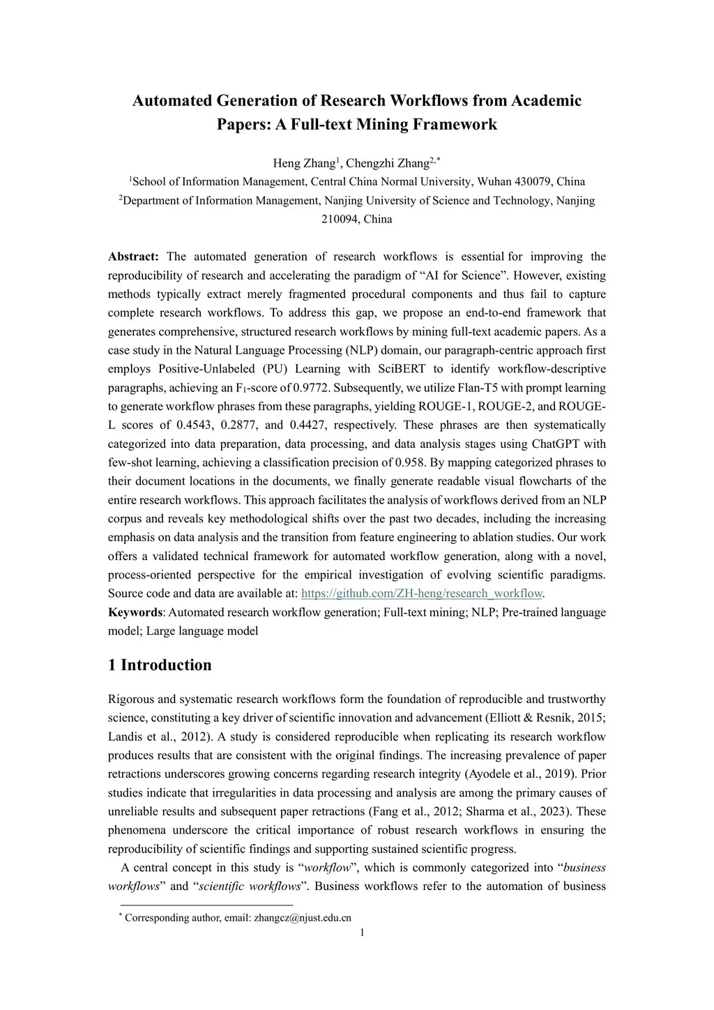 Automated Generation of Research Workflows from Academic Papers: A Full-text Mining Framework