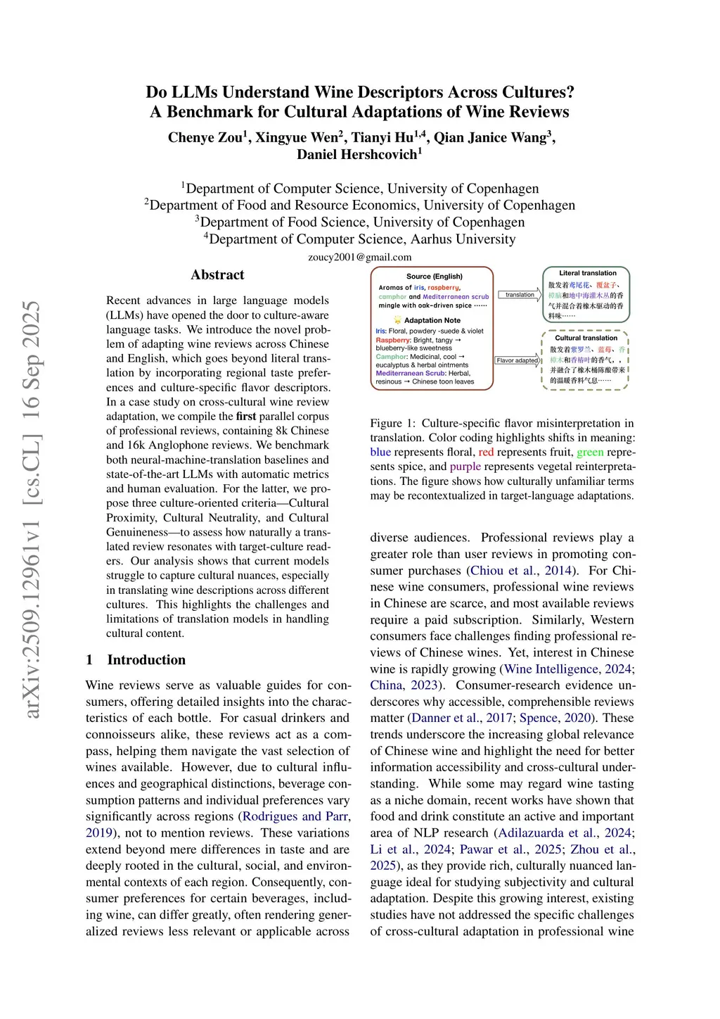 Recent advances in large language models (LLMs) have opened the door to culture-aware language tasks. We introduce the novel problem of adapting wine reviews across Chinese and English, which goes beyond literal translation by incorporating regional taste preferences and culture-specific flavor descriptors. In a case study on cross-cultural wine review adaptation, we compile the first parallel corpus of professional reviews, containing 8k Chinese and 16k Anglophone reviews. We benchmark both neural-machine-translation baselines and state-of-the-art LLMs with automatic metrics and human evaluation. For the latter, we propose three culture-oriented criteria -- Cultural Proximity, Cultural Neutrality, and Cultural Genuineness -- to assess how naturally a translated review resonates with target-culture readers. Our analysis shows that current models struggle to capture cultural nuances, especially in translating wine descriptions across different cultures. This highlights the challenges and limitations of translation models in handling cultural content.