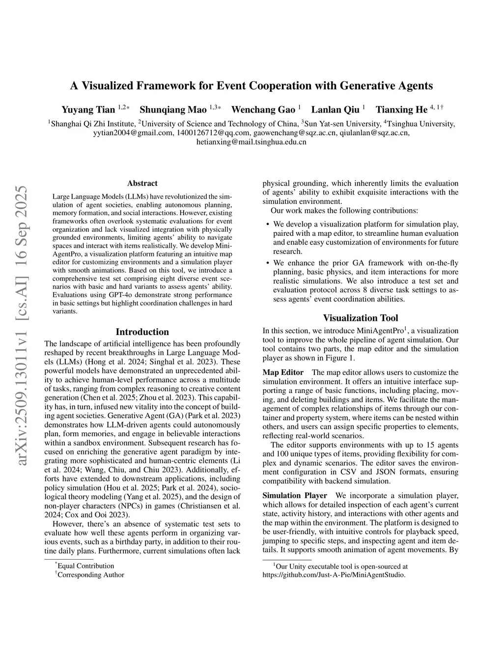 Large Language Models (LLMs) have revolutionized the simulation of agent societies, enabling autonomous planning, memory formation, and social interactions. However, existing frameworks often overlook systematic evaluations for event organization and lack visualized integration with physically grounded environments, limiting agents' ability to navigate spaces and interact with items realistically. We develop MiniAgentPro, a visualization platform featuring an intuitive map editor for customizing environments and a simulation player with smooth animations. Based on this tool, we introduce a comprehensive test set comprising eight diverse event scenarios with basic and hard variants to assess agents' ability. Evaluations using GPT-4o demonstrate strong performance in basic settings but highlight coordination challenges in hard variants.