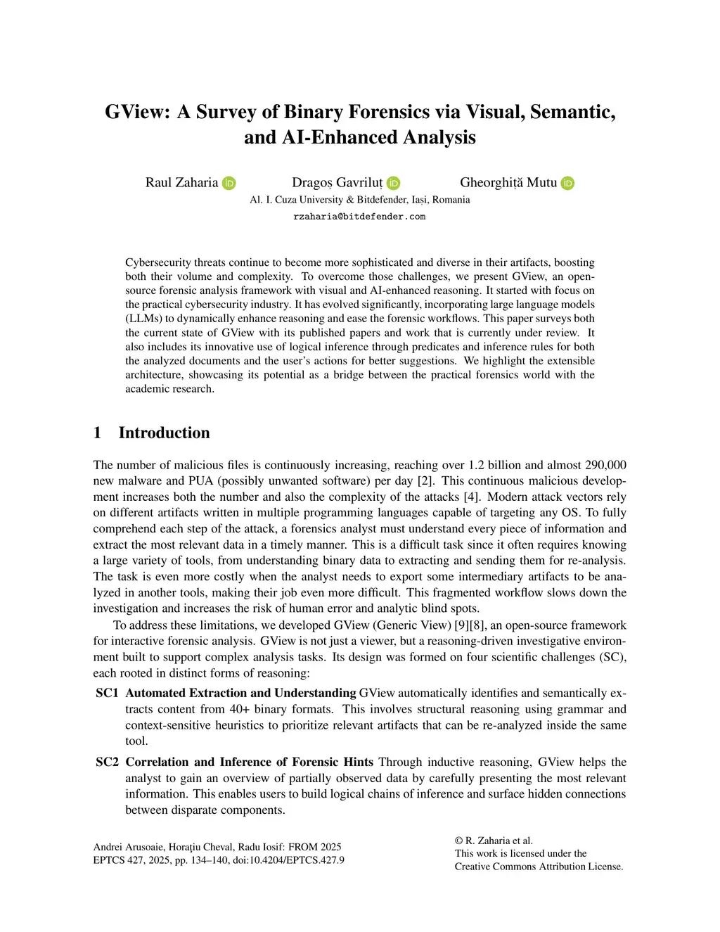 Cybersecurity threats continue to become more sophisticated and diverse in their artifacts, boosting both their volume and complexity. To overcome those challenges, we present GView, an open-source forensic analysis framework with visual and AI-enhanced reasoning. It started with focus on the practical cybersecurity industry. It has evolved significantly, incorporating large language models (LLMs) to dynamically enhance reasoning and ease the forensic workflows. This paper surveys both the current state of GView with its published papers alongside those that are in the publishing process. It also includes its innovative use of logical inference through predicates and inference rules for both the analyzed documents and the user's actions for better suggestions. We highlight the extensible architecture, showcasing its potential as a bridge between the practical forensics worlds with the academic research.