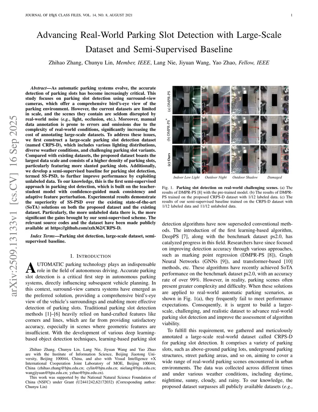As automatic parking systems evolve, the accurate detection of parking slots has become increasingly critical. This study focuses on parking slot detection using surround-view cameras, which offer a comprehensive bird's-eye view of the parking environment. However, the current datasets are limited in scale, and the scenes they contain are seldom disrupted by real-world noise (e.g., light, occlusion, etc.). Moreover, manual data annotation is prone to errors and omissions due to the complexity of real-world conditions, significantly increasing the cost of annotating large-scale datasets. To address these issues, we first construct a large-scale parking slot detection dataset (named CRPS-D), which includes various lighting distributions, diverse weather conditions, and challenging parking slot variants. Compared with existing datasets, the proposed dataset boasts the largest data scale and consists of a higher density of parking slots, particularly featuring more slanted parking slots. Additionally, we develop a semi-supervised baseline for parking slot detection, termed SS-PSD, to further improve performance by exploiting unlabeled data. To our knowledge, this is the first semi-supervised approach in parking slot detection, which is built on the teacher-student model with confidence-guided mask consistency and adaptive feature perturbation. Experimental results demonstrate the superiority of SS-PSD over the existing state-of-the-art (SoTA) solutions on both the proposed dataset and the existing dataset. Particularly, the more unlabeled data there is, the more significant the gains brought by our semi-supervised scheme. The relevant source codes and the dataset have been made publicly available atthis https URL.
