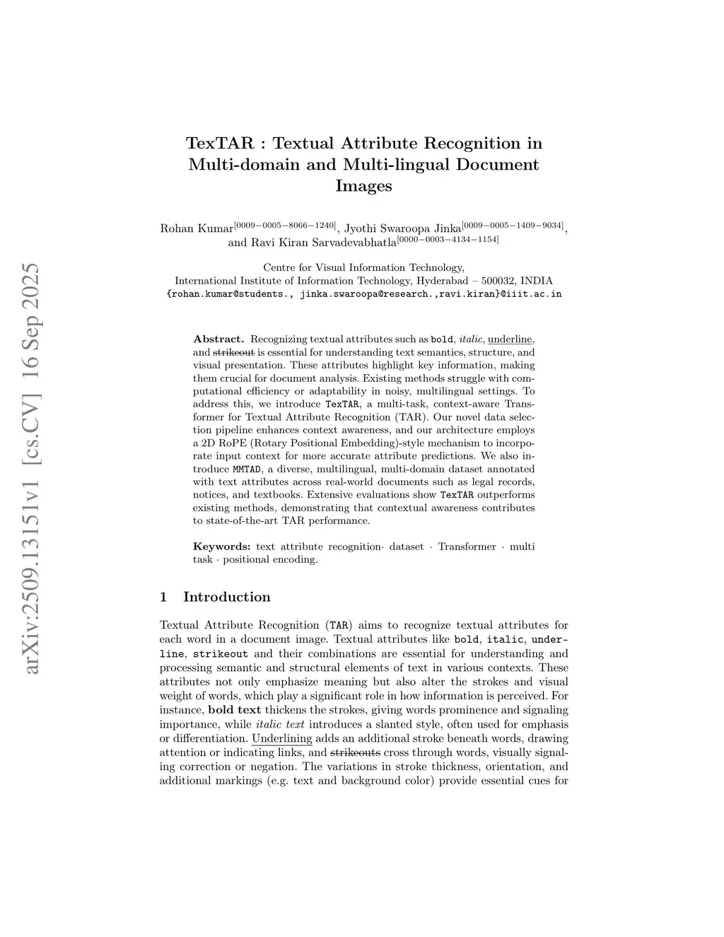 Recognizing textual attributes such as bold, italic, underline and strikeout is essential for understanding text semantics, structure, and visual presentation. These attributes highlight key information, making them crucial for document analysis. Existing methods struggle with computational efficiency or adaptability in noisy, multilingual settings. To address this, we introduce TexTAR, a multi-task, context-aware Transformer for Textual Attribute Recognition (TAR). Our novel data selection pipeline enhances context awareness, and our architecture employs a 2D RoPE (Rotary Positional Embedding)-style mechanism to incorporate input context for more accurate attribute predictions. We also introduce MMTAD, a diverse, multilingual, multi-domain dataset annotated with text attributes across real-world documents such as legal records, notices, and textbooks. Extensive evaluations show TexTAR outperforms existing methods, demonstrating that contextual awareness contributes to state-of-the-art TAR performance.