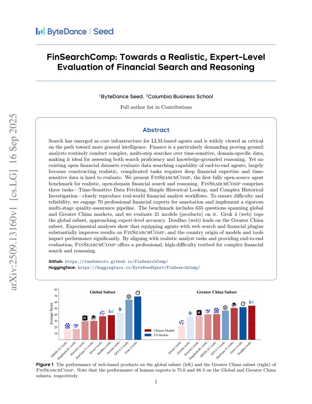 Search has emerged as core infrastructure for LLM-based agents and is widely viewed as critical on the path toward more general intelligence. Finance is a particularly demanding proving ground: analysts routinely conduct complex, multi-step searches over time-sensitive, domain-specific data, making it ideal for assessing both search proficiency and knowledge-grounded reasoning. Yet no existing open financial datasets evaluate data searching capability of end-to-end agents, largely because constructing realistic, complicated tasks requires deep financial expertise and time-sensitive data is hard to evaluate. We present FinSearchComp, the first fully open-source agent benchmark for realistic, open-domain financial search and reasoning. FinSearchComp comprises three tasks -- Time-Sensitive Data Fetching, Simple Historical Lookup, and Complex Historical Investigation -- closely reproduce real-world financial analyst workflows. To ensure difficulty and reliability, we engage 70 professional financial experts for annotation and implement a rigorous multi-stage quality-assurance pipeline. The benchmark includes 635 questions spanning global and Greater China markets, and we evaluate 21 models (products) on it. Grok 4 (web) tops the global subset, approaching expert-level accuracy. DouBao (web) leads on the Greater China subset. Experimental analyses show that equipping agents with web search and financial plugins substantially improves results on FinSearchComp, and the country origin of models and tools impact performancethis http URLaligning with realistic analyst tasks and providing end-to-end evaluation, FinSearchComp offers a professional, high-difficulty testbed for complex financial search and reasoning.