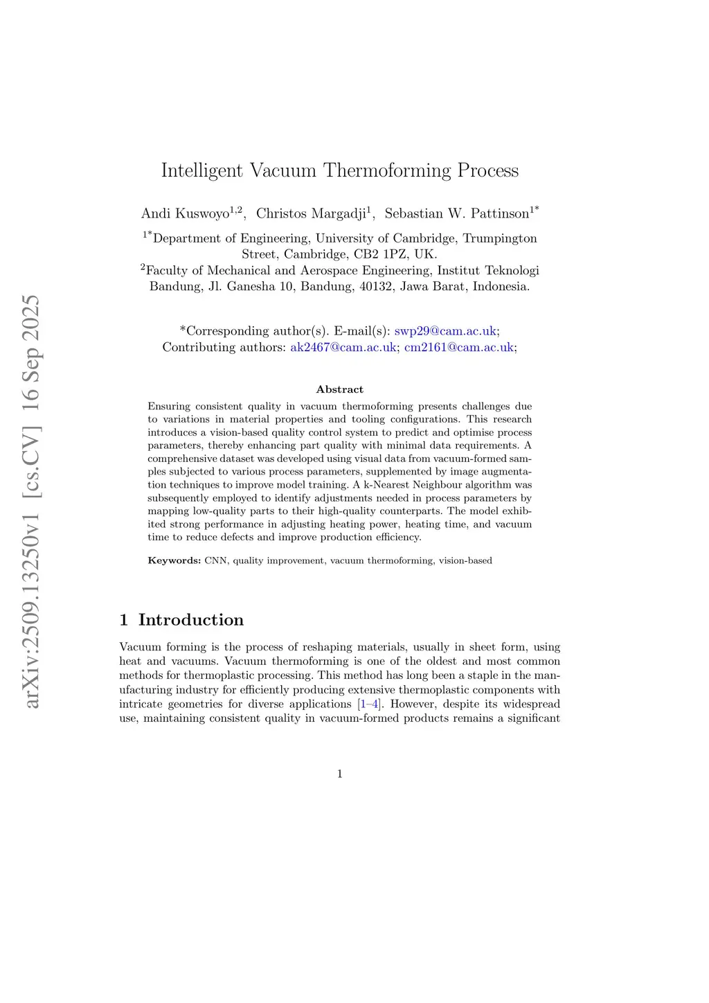 Ensuring consistent quality in vacuum thermoforming presents challenges due to variations in material properties and tooling configurations. This research introduces a vision-based quality control system to predict and optimise process parameters, thereby enhancing part quality with minimal data requirements. A comprehensive dataset was developed using visual data from vacuum-formed samples subjected to various process parameters, supplemented by image augmentation techniques to improve model training. A k-Nearest Neighbour algorithm was subsequently employed to identify adjustments needed in process parameters by mapping low-quality parts to their high-quality counterparts. The model exhibited strong performance in adjusting heating power, heating time, and vacuum time to reduce defects and improve production efficiency.