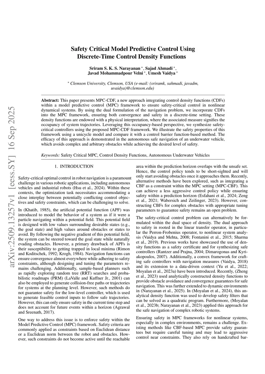 This paper presents MPC-CDF, a new approach integrating control density functions (CDFs) within a model predictive control (MPC) framework to ensure safety-critical control in nonlinear dynamical systems. By using the dual formulation of the navigation problem, we incorporate CDFs into the MPC framework, ensuring both convergence and safety in a discrete-time setting. These density functions are endowed with a physical interpretation, where the associated measure signifies the occupancy of system trajectories. Leveraging this occupancy-based perspective, we synthesize safety-critical controllers using the proposed MPC-CDF framework. We illustrate the safety properties of this framework using a unicycle model and compare it with a control barrier function-based method. The efficacy of this approach is demonstrated in the autonomous safe navigation of an underwater vehicle, which avoids complex and arbitrary obstacles while achieving the desired level of safety.