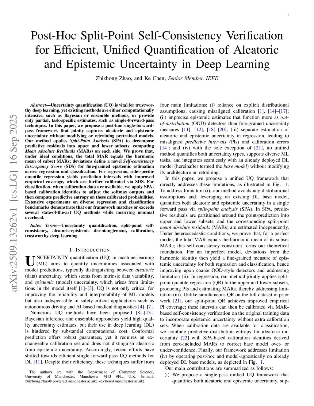 Post-Hoc Split-Point Self-Consistency Verification for Efficient, Unified Quantification of Aleatoric and Epistemic Uncertainty in Deep Learning