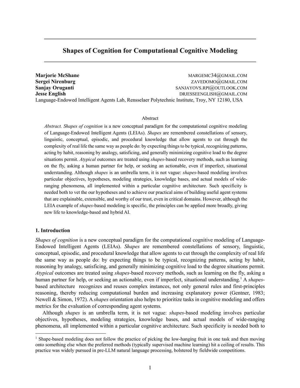 Shapes of cognition is a new conceptual paradigm for the computational cognitive modeling of Language-Endowed Intelligent Agents (LEIAs). Shapes are remembered constellations of sensory, linguistic, conceptual, episodic, and procedural knowledge that allow agents to cut through the complexity of real life the same way as people do: by expecting things to be typical, recognizing patterns, acting by habit, reasoning by analogy, satisficing, and generally minimizing cognitive load to the degree situations permit. Atypical outcomes are treated using shapes-based recovery methods, such as learning on the fly, asking a human partner for help, or seeking an actionable, even if imperfect, situational understanding. Although shapes is an umbrella term, it is not vague: shapes-based modeling involves particular objectives, hypotheses, modeling strategies, knowledge bases, and actual models of wide-ranging phenomena, all implemented within a particular cognitive architecture. Such specificity is needed both to vet our hypotheses and to achieve our practical aims of building useful agent systems that are explainable, extensible, and worthy of our trust, even in critical domains. However, although the LEIA example of shapes-based modeling is specific, the principles can be applied more broadly, giving new life to knowledge-based and hybrid AI.