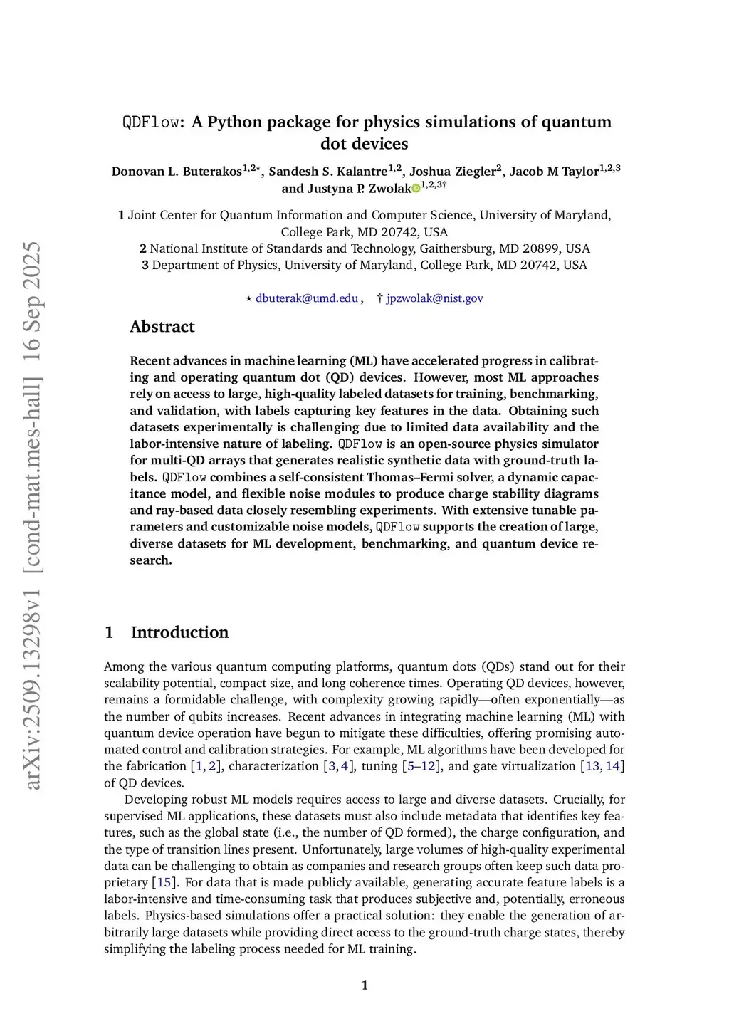 Recent advances in machine learning (ML) have accelerated progress in calibrating and operating quantum dot (QD) devices. However, most ML approaches rely on access to large, representative datasets designed to capture the full spectrum of data quality encountered in practice, with both high- and low-quality data for training, benchmarking, and validation, with labels capturing key features of the device state. Collating such datasets experimentally is challenging due to limited data availability, slow measurement bandwidths, and the labor-intensive nature of labeling. QDFlow is an open-source physics simulator for multi-QD arrays that generates realistic synthetic data with ground-truth labels. QDFlow combines a self-consistent Thomas-Fermi solver, a dynamic capacitance model, and flexible noise modules to simulate charge stability diagrams and ray-based data that closely resemble experimental results. With an extensive set of parameters that can be varied and customizable noise models, QDFlow supports the creation of large, diverse datasets for ML development, benchmarking, and quantum device research.}}
