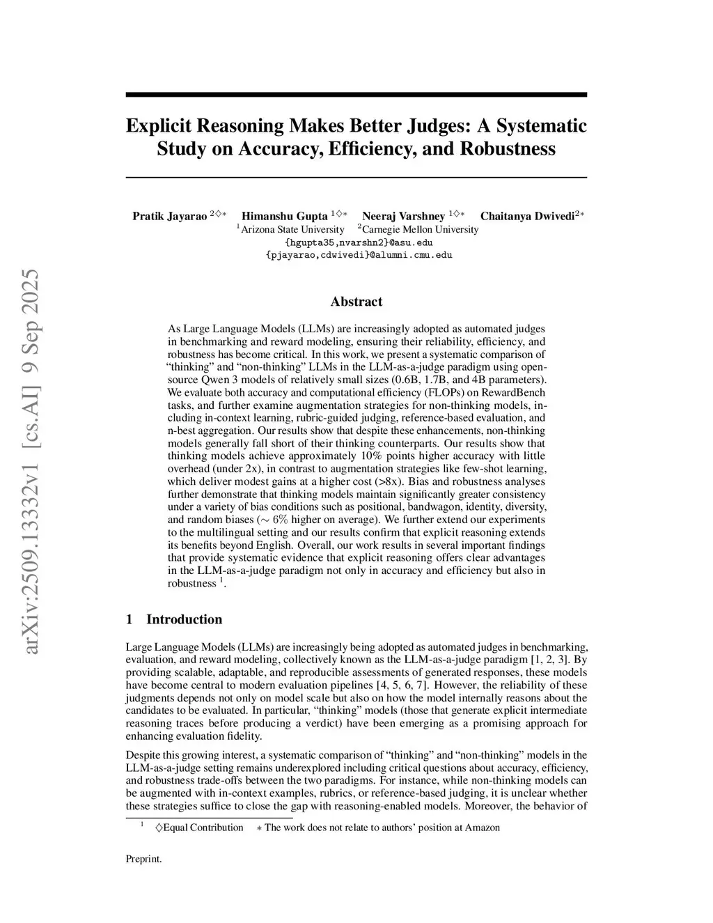 As Large Language Models (LLMs) are increasingly adopted as automated judges in benchmarking and reward modeling, ensuring their reliability, efficiency, and robustness has become critical. In this work, we present a systematic comparison of "thinking" and "non-thinking" LLMs in the LLM-as-a-judge paradigm using open-source Qwen 3 models of relatively small sizes (0.6B, 1.7B, and 4B parameters). We evaluate both accuracy and computational efficiency (FLOPs) on RewardBench tasks, and further examine augmentation strategies for non-thinking models, including in-context learning, rubric-guided judging, reference-based evaluation, and n-best aggregation. Our results show that despite these enhancements, non-thinking models generally fall short of their thinking counterparts. Our results show that thinking models achieve approximately 10% points higher accuracy with little overhead (under 2x), in contrast to augmentation strategies like few-shot learning, which deliver modest gains at a higher cost (>8x). Bias and robustness analyses further demonstrate that thinking models maintain significantly greater consistency under a variety of bias conditions such as positional, bandwagon, identity, diversity, and random biases (6% higher on average). We further extend our experiments to the multilingual setting and our results confirm that explicit reasoning extends its benefits beyond English. Overall, our work results in several important findings that provide systematic evidence that explicit reasoning offers clear advantages in the LLM-as-a-judge paradigm not only in accuracy and efficiency but also in robustness.
