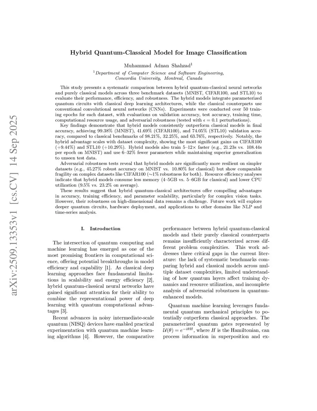 This study presents a systematic comparison between hybrid quantum-classical neural networks and purely classical models across three benchmark datasets (MNIST, CIFAR100, and STL10) to evaluate their performance, efficiency, and robustness. The hybrid models integrate parameterized quantum circuits with classical deep learning architectures, while the classical counterparts use conventional convolutional neural networks (CNNs). Experiments were conducted over 50 training epochs for each dataset, with evaluations on validation accuracy, test accuracy, training time, computational resource usage, and adversarial robustness (tested with perturbations).Key findings demonstrate that hybrid models consistently outperform classical models in final accuracy, achieving {99.38\% (MNIST), 41.69\% (CIFAR100), and 74.05\% (STL10) validation accuracy, compared to classical benchmarks of 98.21\%, 32.25\%, and 63.76\%, respectively. Notably, the hybrid advantage scales with dataset complexity, showing the most significant gains on CIFAR100 (+9.44\%) and STL10 (+10.29\%). Hybrid models also train 5--12 faster (e.g., 21.23s vs. 108.44s per epoch on MNIST) and use 6--32\% fewer parameters} while maintaining superior generalization to unseen testthis http URLrobustness tests reveal that hybrid models are significantly more resilient on simpler datasets (e.g., 45.27\% robust accuracy on MNIST vs. 10.80\% for classical) but show comparable fragility on complex datasets like CIFAR100 (1\% robustness for both). Resource efficiency analyses indicate that hybrid models consume less memory (4--5GB vs. 5--6GB for classical) and lower CPU utilization (9.5\% vs. 23.2\% on average).These results suggest that hybrid quantum-classical architectures offer compelling advantages in accuracy, training efficiency, and parameter scalability, particularly for complex vision tasks.