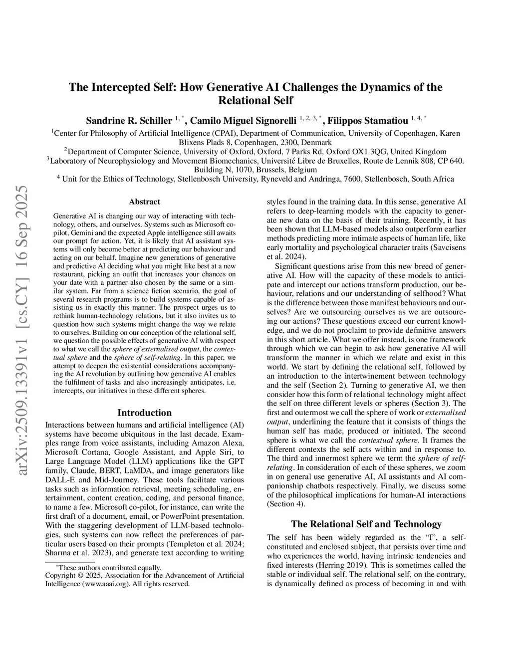 Generative AI is changing our way of interacting with technology, others, and ourselves. Systems such as Microsoft copilot, Gemini and the expected Apple intelligence still awaits our prompt for action. Yet, it is likely that AI assistant systems will only become better at predicting our behaviour and acting on our behalf. Imagine new generations of generative and predictive AI deciding what you might like best at a new restaurant, picking an outfit that increases your chances on your date with a partner also chosen by the same or a similar system. Far from a science fiction scenario, the goal of several research programs is to build systems capable of assisting us in exactly this manner. The prospect urges us to rethink human-technology relations, but it also invites us to question how such systems might change the way we relate to ourselves. Building on our conception of the relational self, we question the possible effects of generative AI with respect to what we call the sphere of externalised output, the contextual sphere and the sphere of self-relating. In this paper, we attempt to deepen the existential considerations accompanying the AI revolution by outlining how generative AI enables the fulfilment of tasks and also increasingly anticipates, i.e. intercepts, our initiatives in these different spheres.