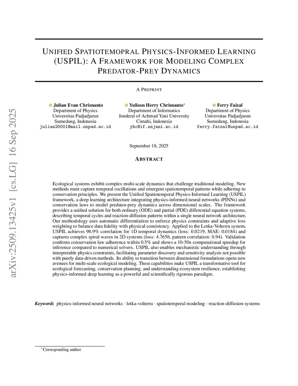Ecological systems exhibit complex multi-scale dynamics that challenge traditional modeling. New methods must capture temporal oscillations and emergent spatiotemporal patterns while adhering to conservation principles. We present the Unified Spatiotemporal Physics-Informed Learning (USPIL) framework, a deep learning architecture integrating physics-informed neural networks (PINNs) and conservation laws to model predator-prey dynamics across dimensional scales. The framework provides a unified solution for both ordinary (ODE) and partial (PDE) differential equation systems, describing temporal cycles and reaction-diffusion patterns within a single neural network architecture. Our methodology uses automatic differentiation to enforce physics constraints and adaptive loss weighting to balance data fidelity with physical consistency. Applied to the Lotka-Volterra system, USPIL achieves 98.9% correlation for 1D temporal dynamics (loss: 0.0219, MAE: 0.0184) and captures complex spiral waves in 2D systems (loss: 4.7656, pattern correlation: 0.94). Validation confirms conservation law adherence within 0.5% and shows a 10-50x computational speedup for inference compared to numerical solvers. USPIL also enables mechanistic understanding through interpretable physics constraints, facilitating parameter discovery and sensitivity analysis not possible with purely data-driven methods. Its ability to transition between dimensional formulations opens new avenues for multi-scale ecological modeling. These capabilities make USPIL a transformative tool for ecological forecasting, conservation planning, and understanding ecosystem resilience, establishing physics-informed deep learning as a powerful and scientifically rigorous paradigm.