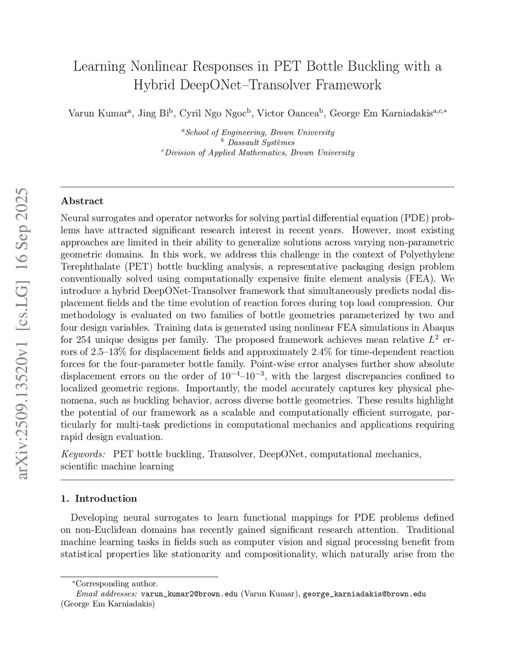 Neural surrogates and operator networks for solving partial differential equation (PDE) problems have attracted significant research interest in recent years. However, most existing approaches are limited in their ability to generalize solutions across varying non-parametric geometric domains. In this work, we address this challenge in the context of Polyethylene Terephthalate (PET) bottle buckling analysis, a representative packaging design problem conventionally solved using computationally expensive finite element analysis (FEA). We introduce a hybrid DeepONet-Transolver framework that simultaneously predicts nodal displacement fields and the time evolution of reaction forces during top load compression. Our methodology is evaluated on two families of bottle geometries parameterized by two and four design variables. Training data is generated using nonlinear FEA simulations in Abaqus for 254 unique designs per family. The proposed framework achieves mean relative errors of 2.5-13% for displacement fields and approximately 2.4% for time-dependent reaction forces for the four-parameter bottle family. Point-wise error analyses further show absolute displacement errors on the order of -, with the largest discrepancies confined to localized geometric regions. Importantly, the model accurately captures key physical phenomena, such as buckling behavior, across diverse bottle geometries. These results highlight the potential of our framework as a scalable and computationally efficient surrogate, particularly for multi-task predictions in computational mechanics and applications requiring rapid design evaluation.