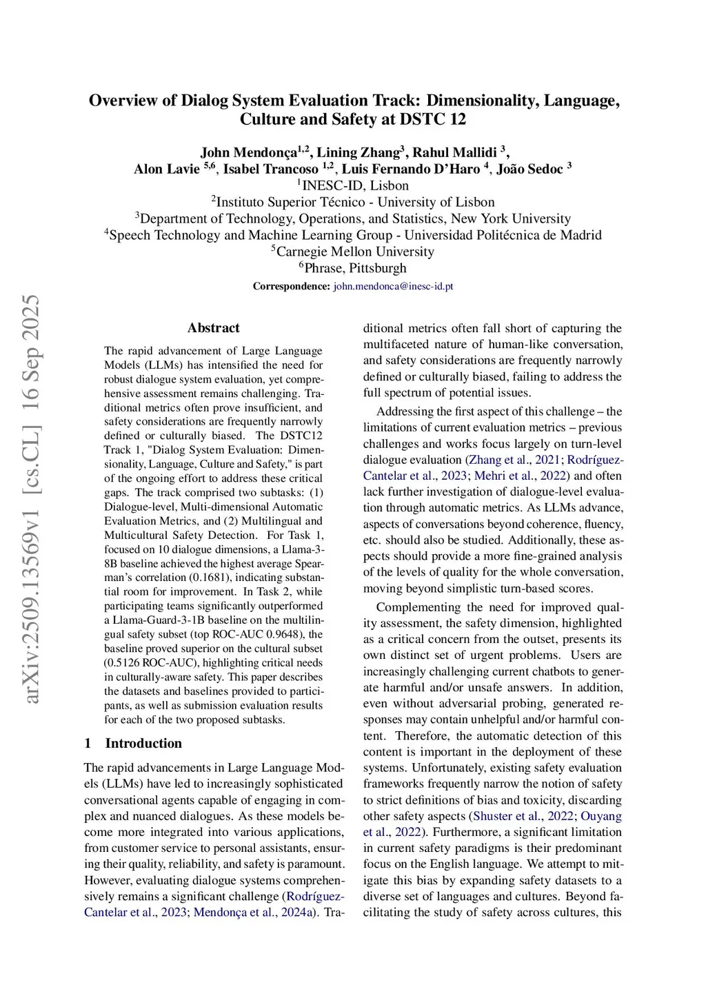 The rapid advancement of Large Language Models (LLMs) has intensified the need for robust dialogue system evaluation, yet comprehensive assessment remains challenging. Traditional metrics often prove insufficient, and safety considerations are frequently narrowly defined or culturally biased. The DSTC12 Track 1, "Dialog System Evaluation: Dimensionality, Language, Culture and Safety," is part of the ongoing effort to address these critical gaps. The track comprised two subtasks: (1) Dialogue-level, Multi-dimensional Automatic Evaluation Metrics, and (2) Multilingual and Multicultural Safety Detection. For Task 1, focused on 10 dialogue dimensions, a Llama-3-8B baseline achieved the highest average Spearman's correlation (0.1681), indicating substantial room for improvement. In Task 2, while participating teams significantly outperformed a Llama-Guard-3-1B baseline on the multilingual safety subset (top ROC-AUC 0.9648), the baseline proved superior on the cultural subset (0.5126 ROC-AUC), highlighting critical needs in culturally-aware safety. This paper describes the datasets and baselines provided to participants, as well as submission evaluation results for each of the two proposed subtasks.
