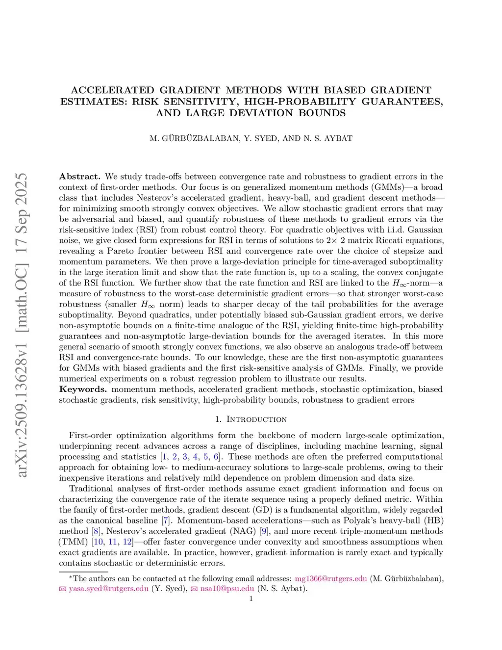 We study trade-offs between convergence rate and robustness to gradient errors in first-order methods. Our focus is on generalized momentum methods (GMMs), a class that includes Nesterov's accelerated gradient, heavy-ball, and gradient descent. We allow stochastic gradient errors that may be adversarial and biased, and quantify robustness via the risk-sensitive index (RSI) from robust control theory. For quadratic objectives with i.i.d. Gaussian noise, we give closed-form expressions for RSI using 2x2 Riccati equations, revealing a Pareto frontier between RSI and convergence rate over stepsize and momentum choices. We prove a large-deviation principle for time-averaged suboptimality and show that the rate function is, up to scaling, the convex conjugate of the RSI. We further connect RSI to the -norm, showing that stronger worst-case robustness (smaller norm) yields sharper decay of tail probabilities. Beyond quadratics, under biased sub-Gaussian gradient errors, we derive non-asymptotic bounds on a finite-time analogue of the RSI, giving finite-time high-probability guarantees and large-deviation bounds. We also observe an analogous trade-off between RSI and convergence-rate bounds for smooth strongly convex functions. To our knowledge, these are the first non-asymptotic guarantees and risk-sensitive analysis of GMMs with biased gradients. Numerical experiments on robust regression illustrate the results.